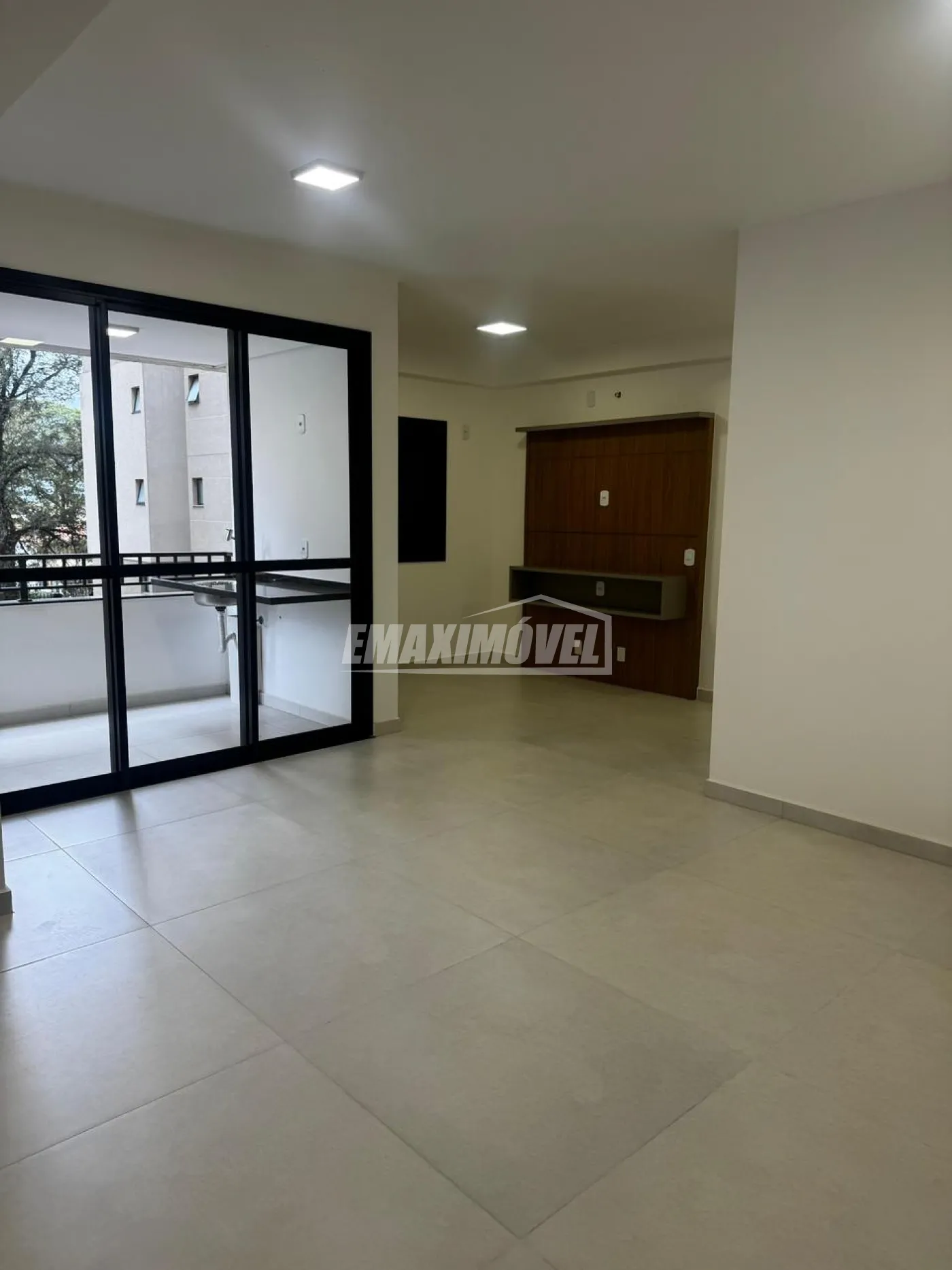 Sala para 2 ambientes com painel para TV integrada com varanda gourmet