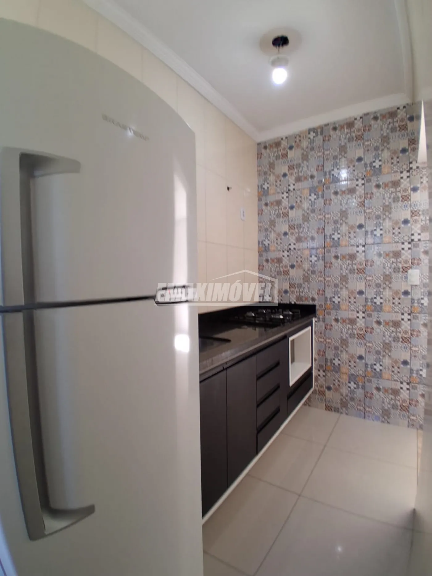 Cozinha com gabinete, cooktop e geladeira