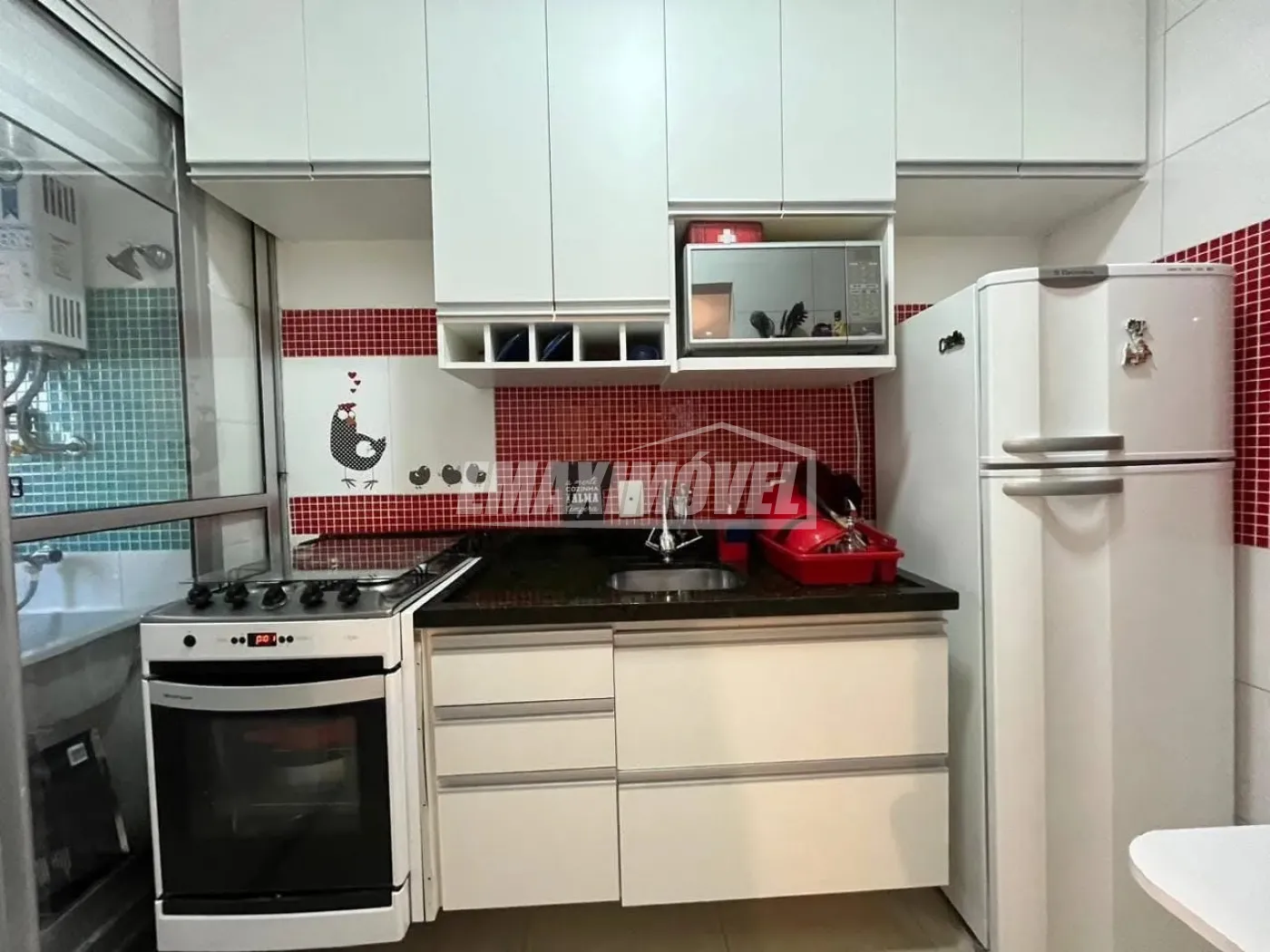 Cozinha com armários modulados, geladeira e fogão