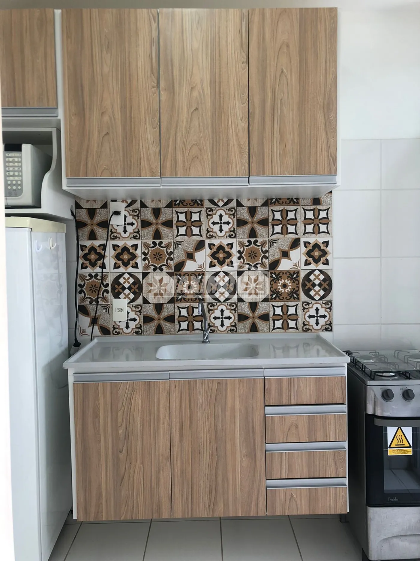 Cozinha com armários planejados, geladeira e fogão