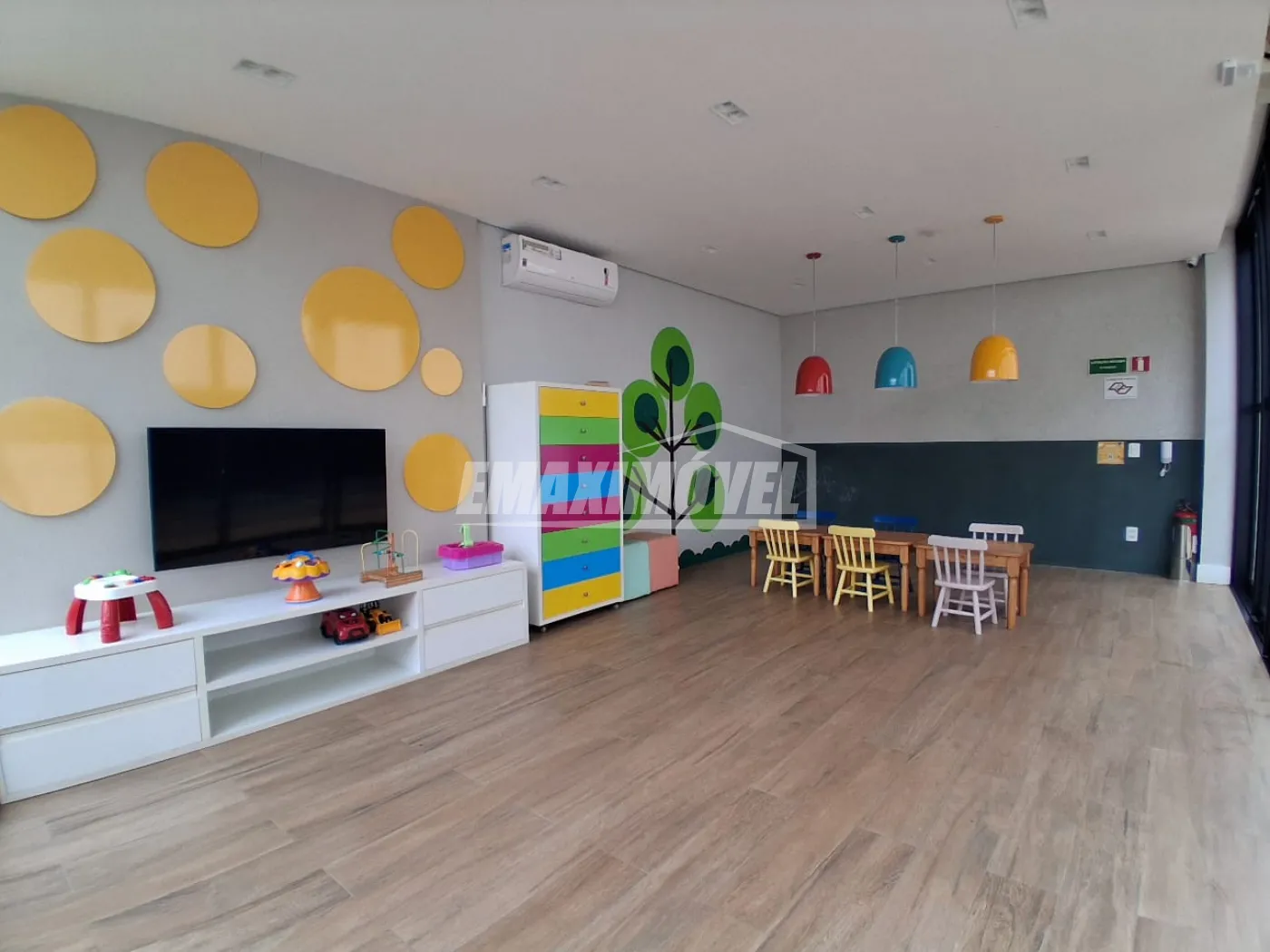 Sala de estar ampla com painel de TV.