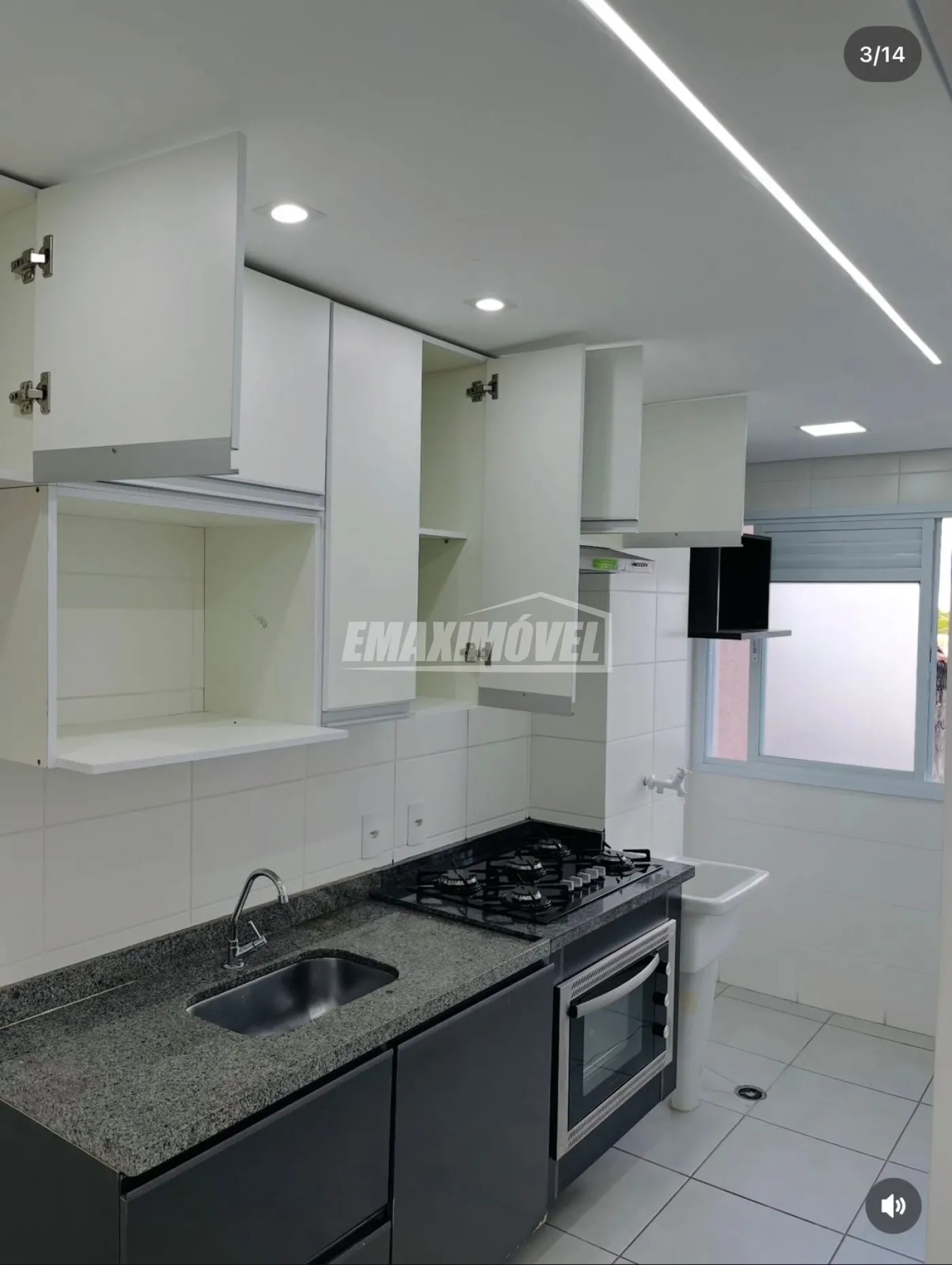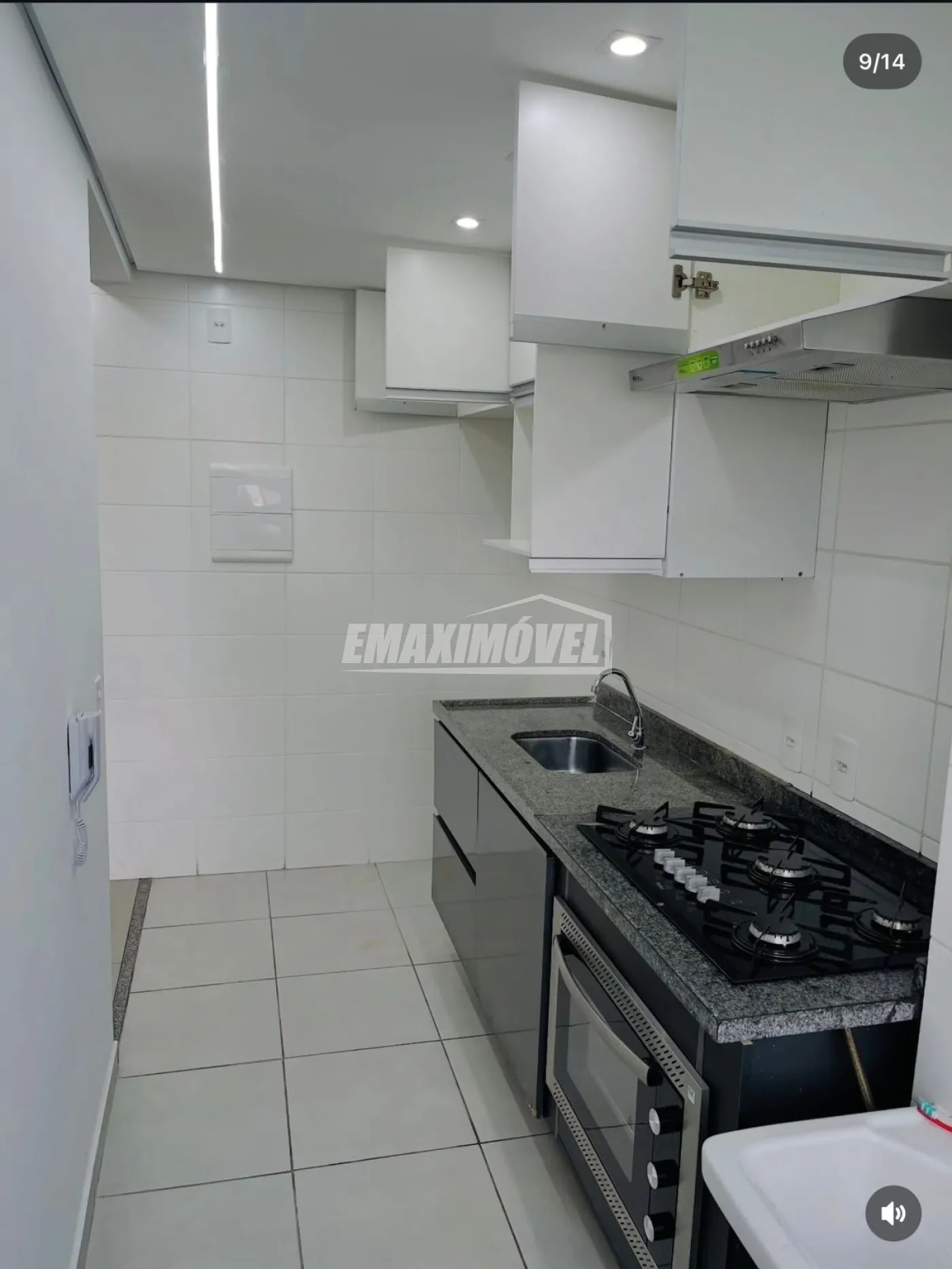 Cozinha equipada com armários, cooktop, forno e exaustor