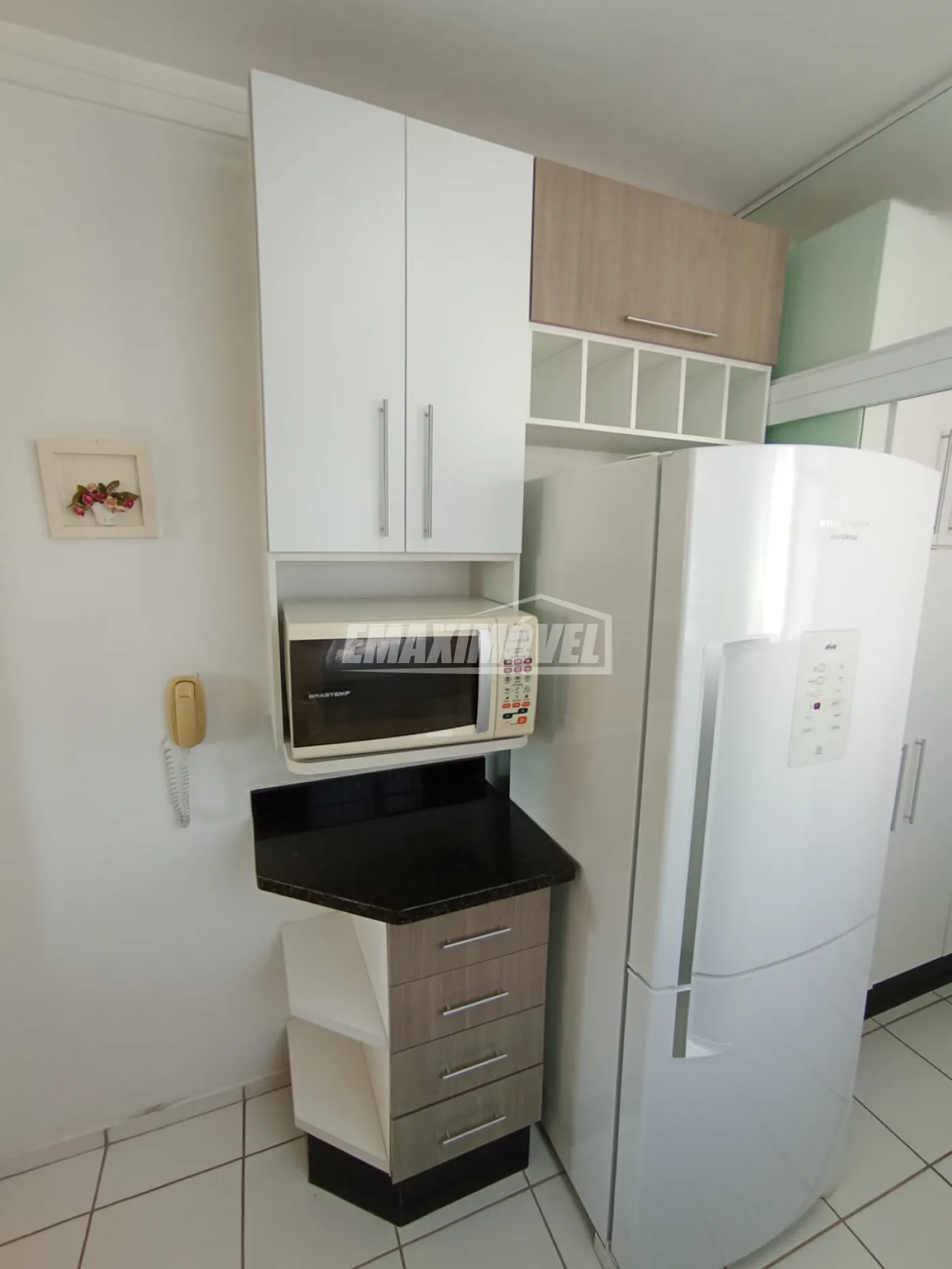 Cozinha equipada com armários planejados, fogão, geladeira e micro-ondas,