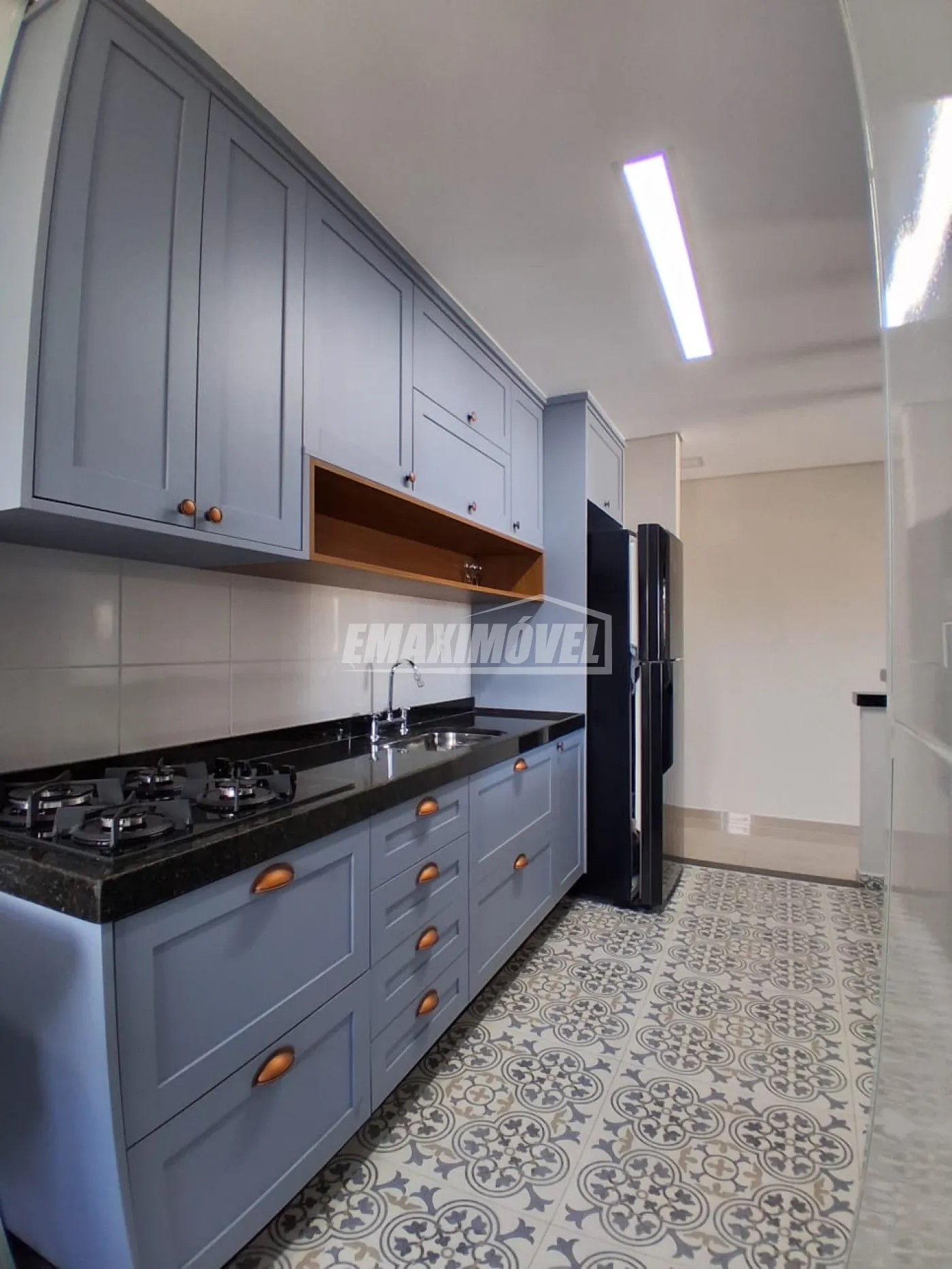 Cozinha totalmente planejada com armários, cooktop, forno e geladeira