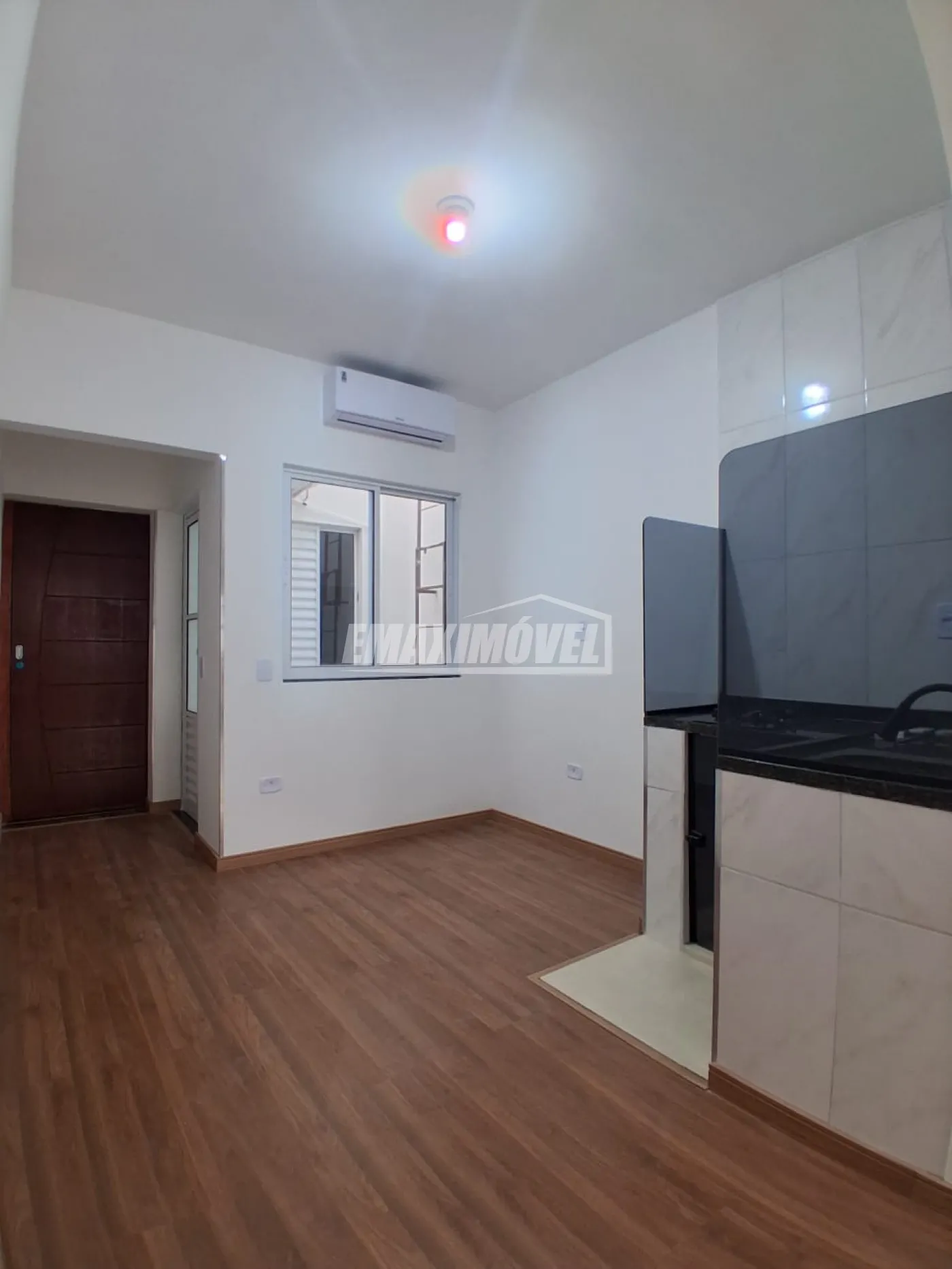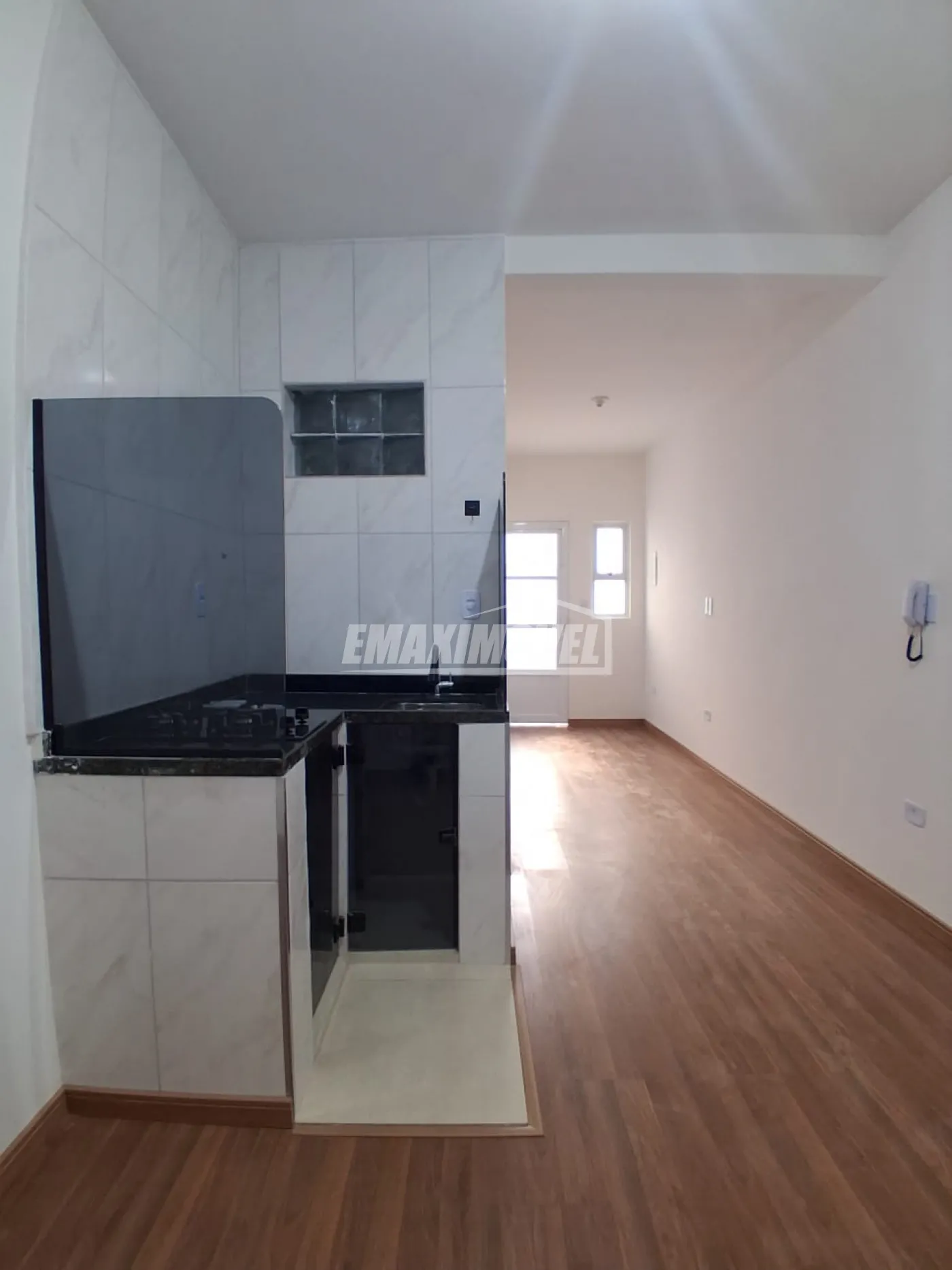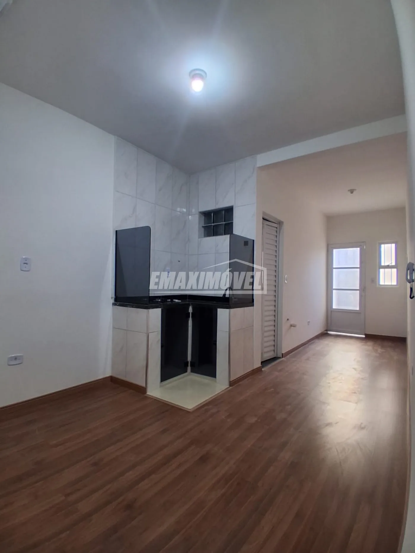 Sala principal ampla integrada à copa com gabinete e cooktop de 2 bocas