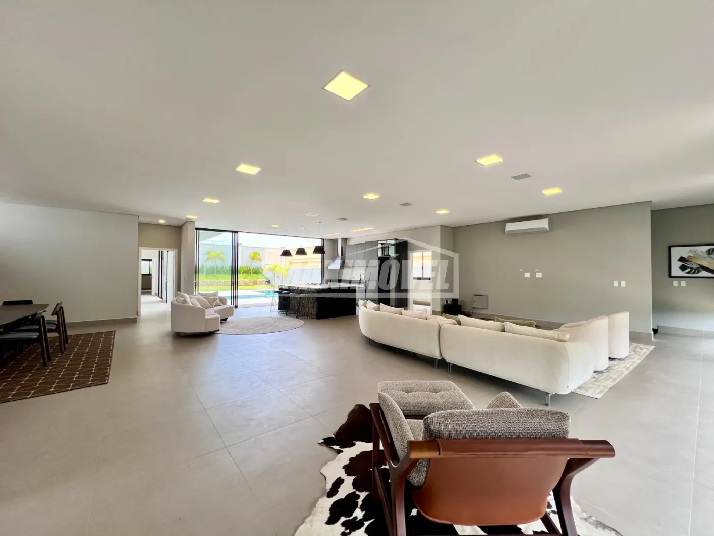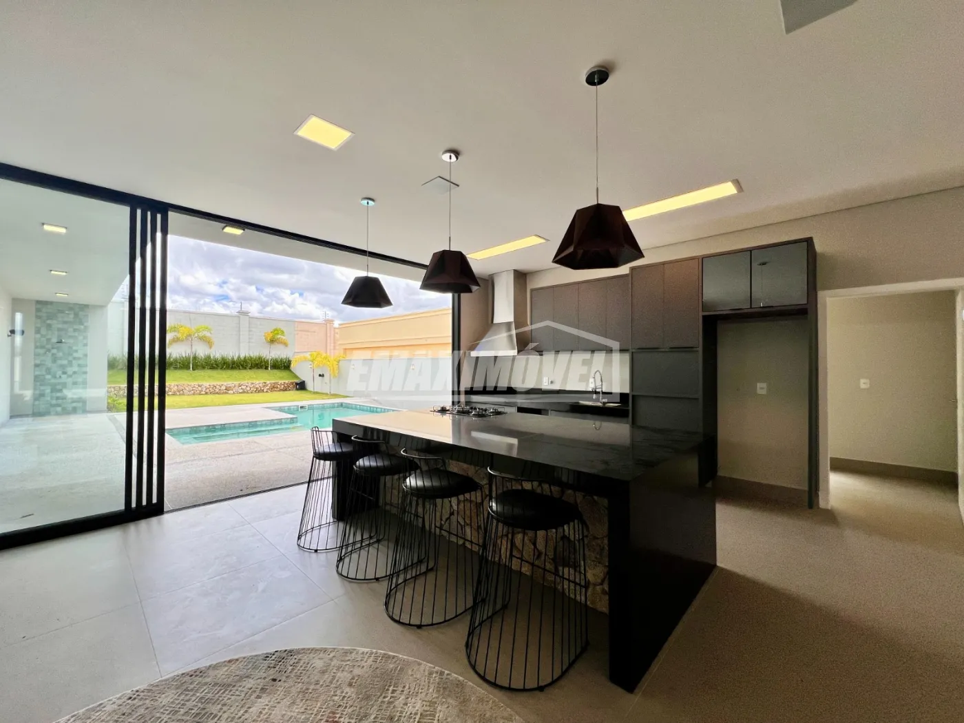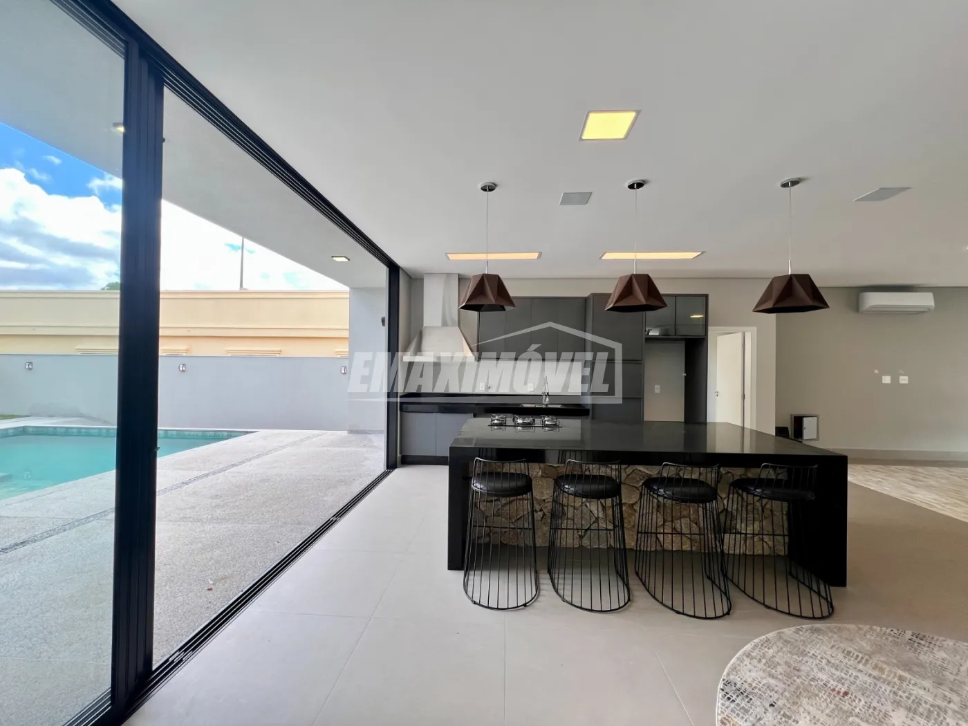 Living integrado com área gourmet e piscina, criando um espaço perfeito para lazer e convivência