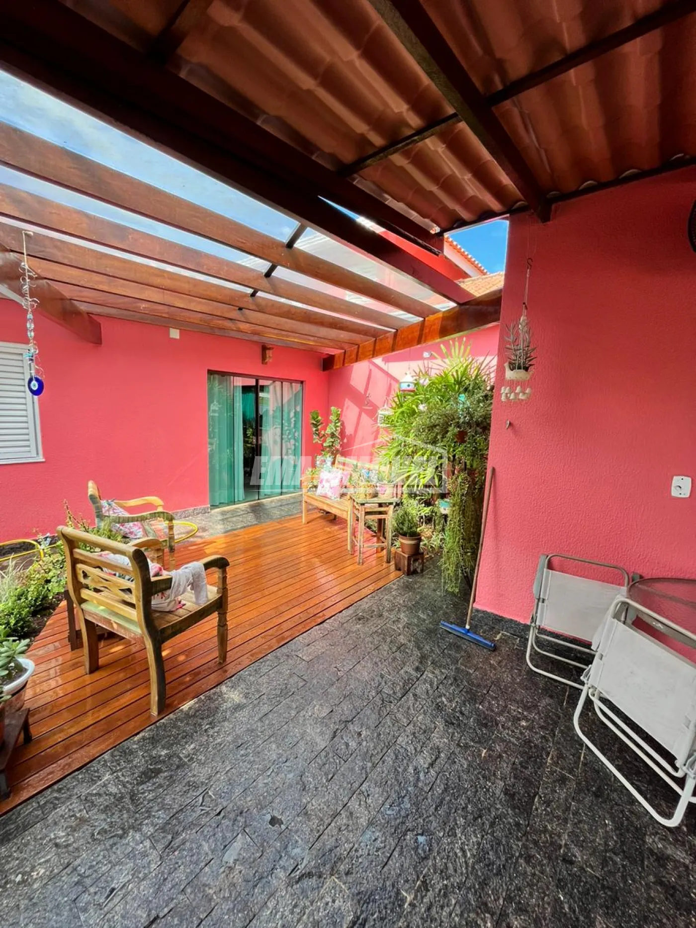 Deck de madeira e jardim;