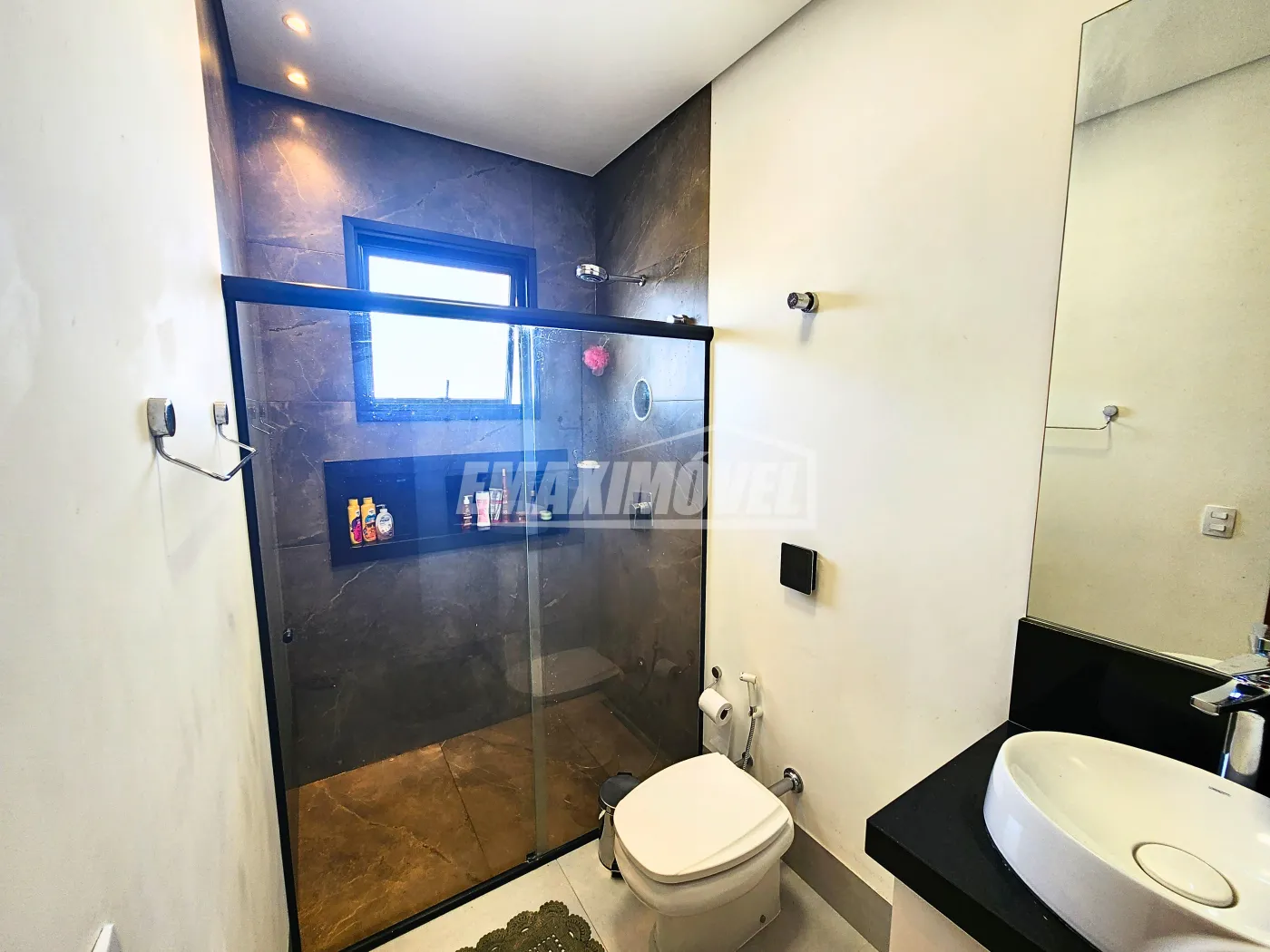 ?Suíte master com pia dupla em mármore Cinza Prime e chuveiro duplo.