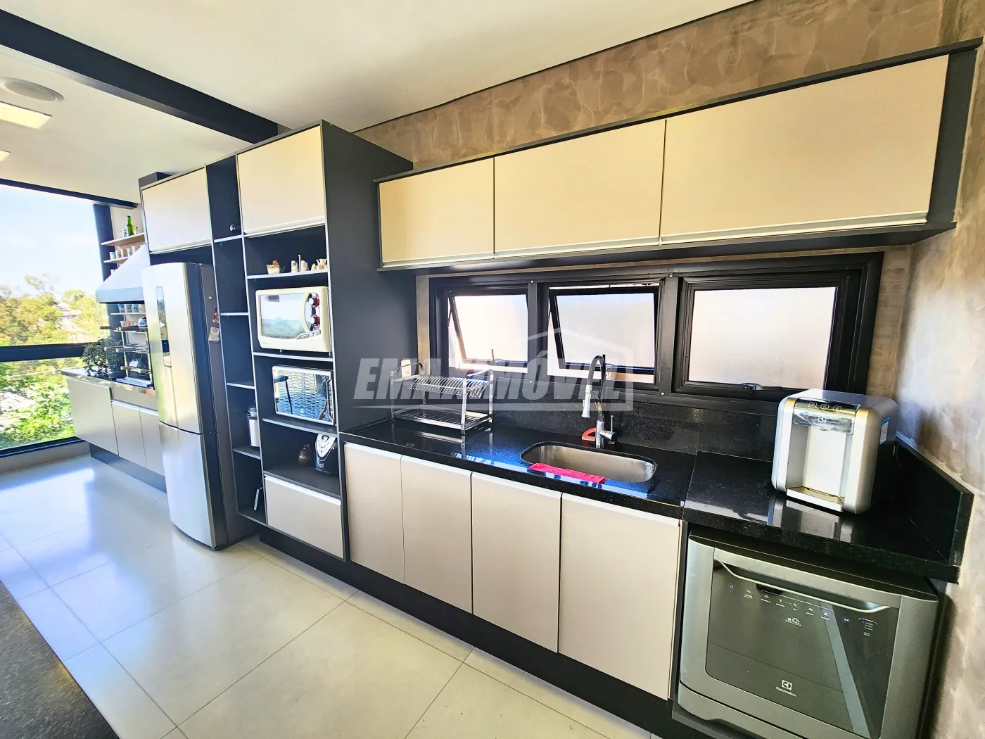?Maravilhosa área gourmet com imensa ilha de mármore são Gabriel escovado, bancada completa com churrasqueira embutida a carvão com parede dupla de inox e torneira gourmet monocomando 100% metal black matte com uma vista linda para piscina de 7,5mx2,5m prainha com spa 7 pontos de hidro em revestimento nobre de pastilha Seychelles com cascata em inox e iluminação RGB Led com controle remoto e uma moderna lareira externa a etanol.