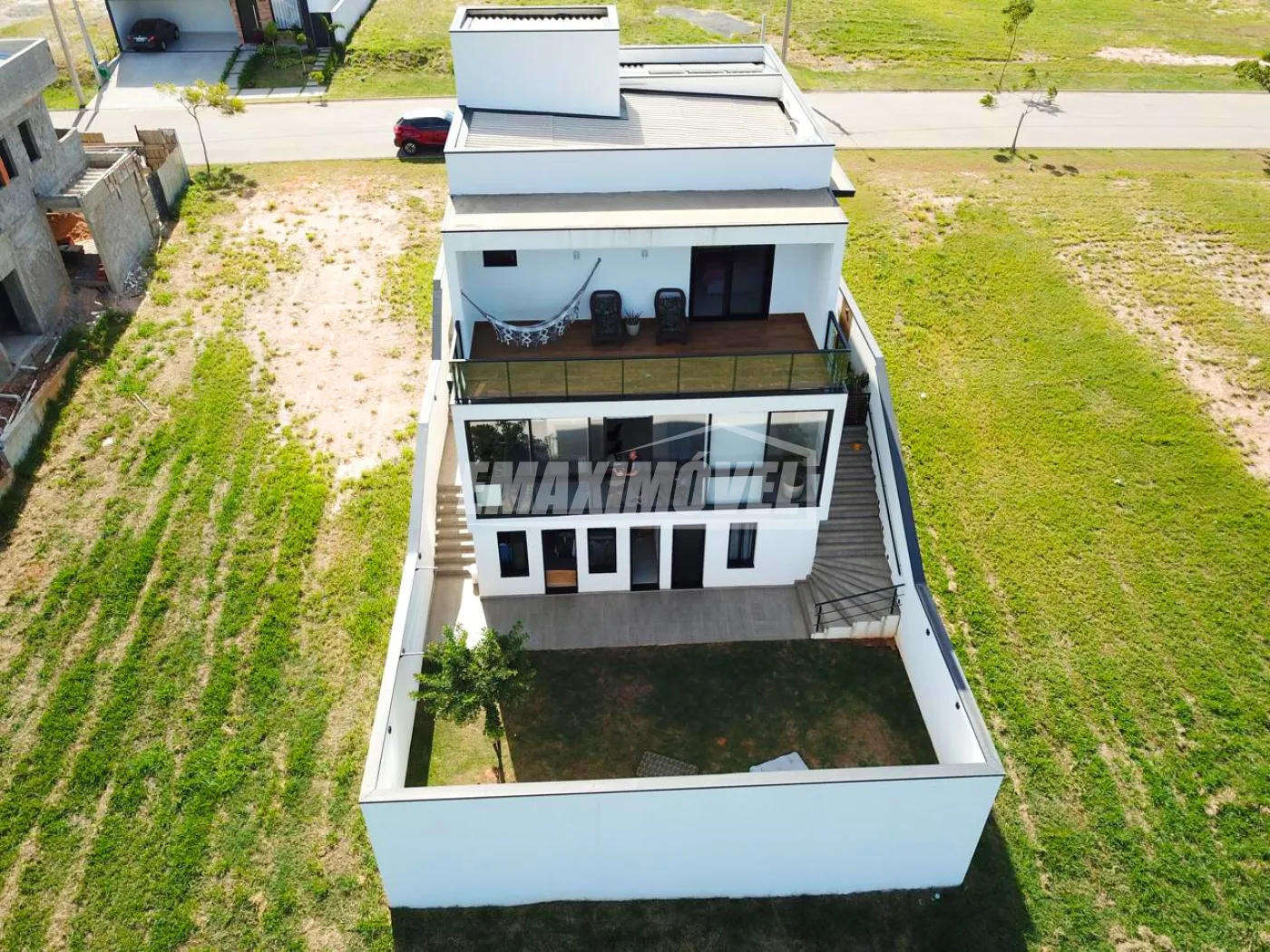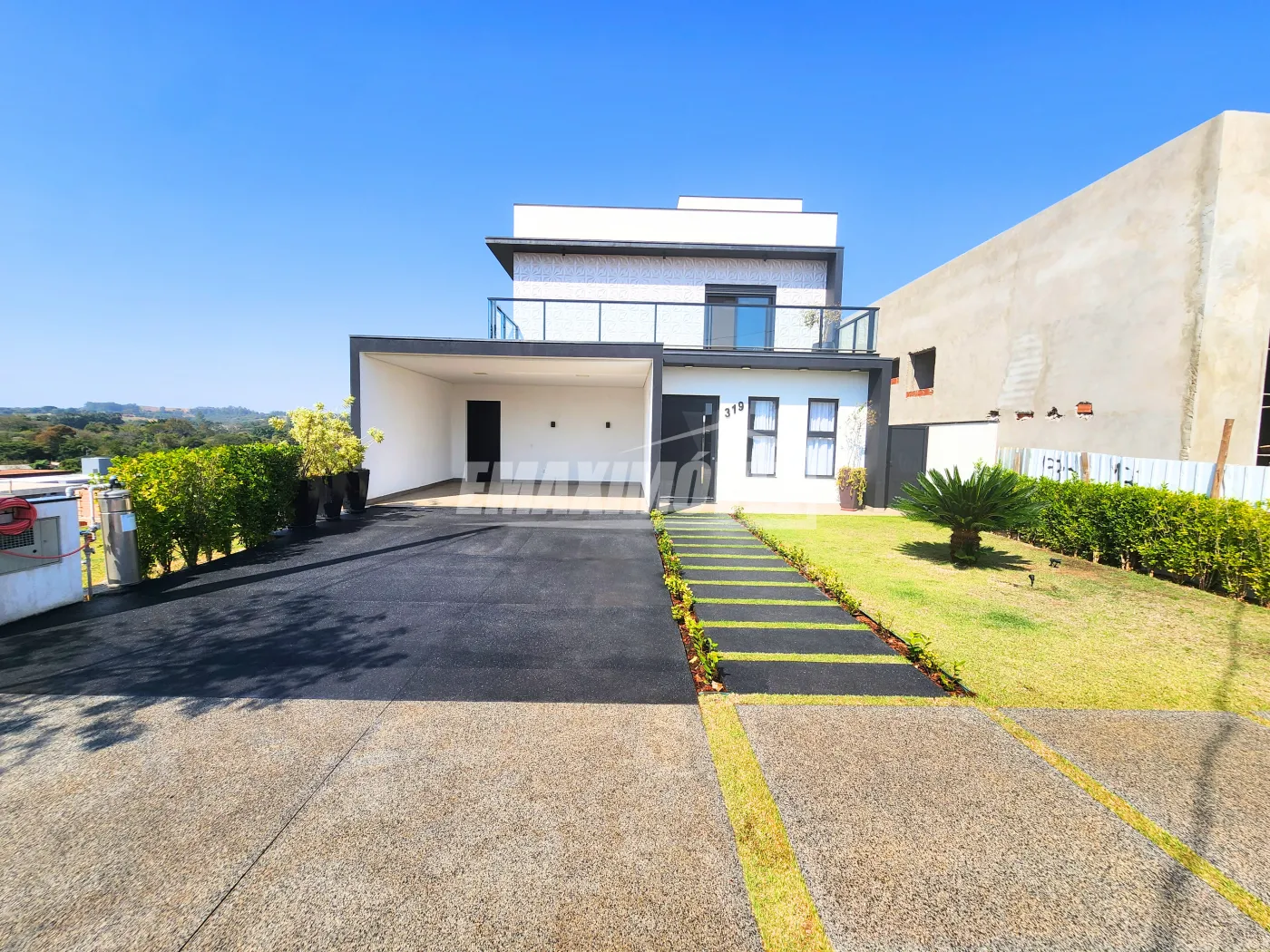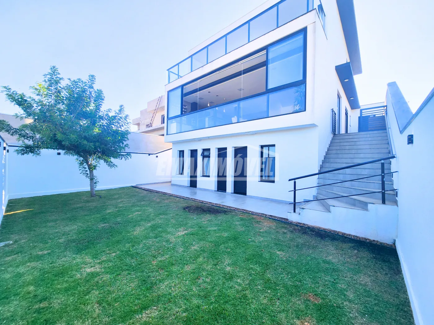 ?Fachada com arquitetura moderna e imponente Chegando a 7 metros de altura ao estilo minimalista, detalhes em revestimentos cristais, painel ripado de alumínio amadeirado, janelas em brise oculto e porta pivotante de 4,60m de altura com fechadura eletrônica, vaga para 4 carros sendo 2 cobertos.