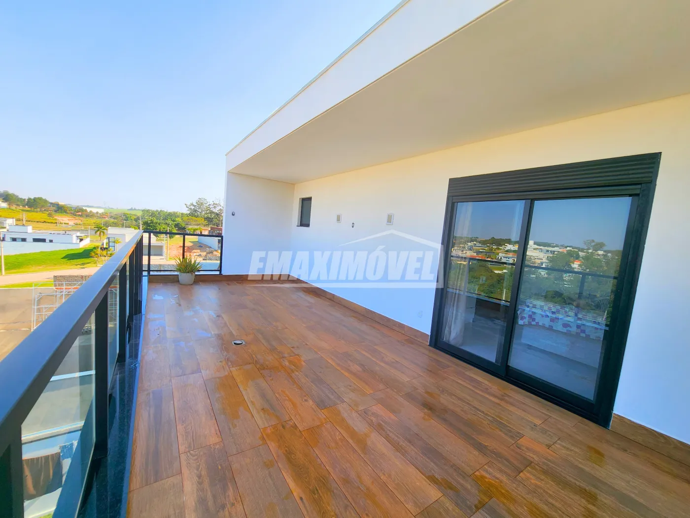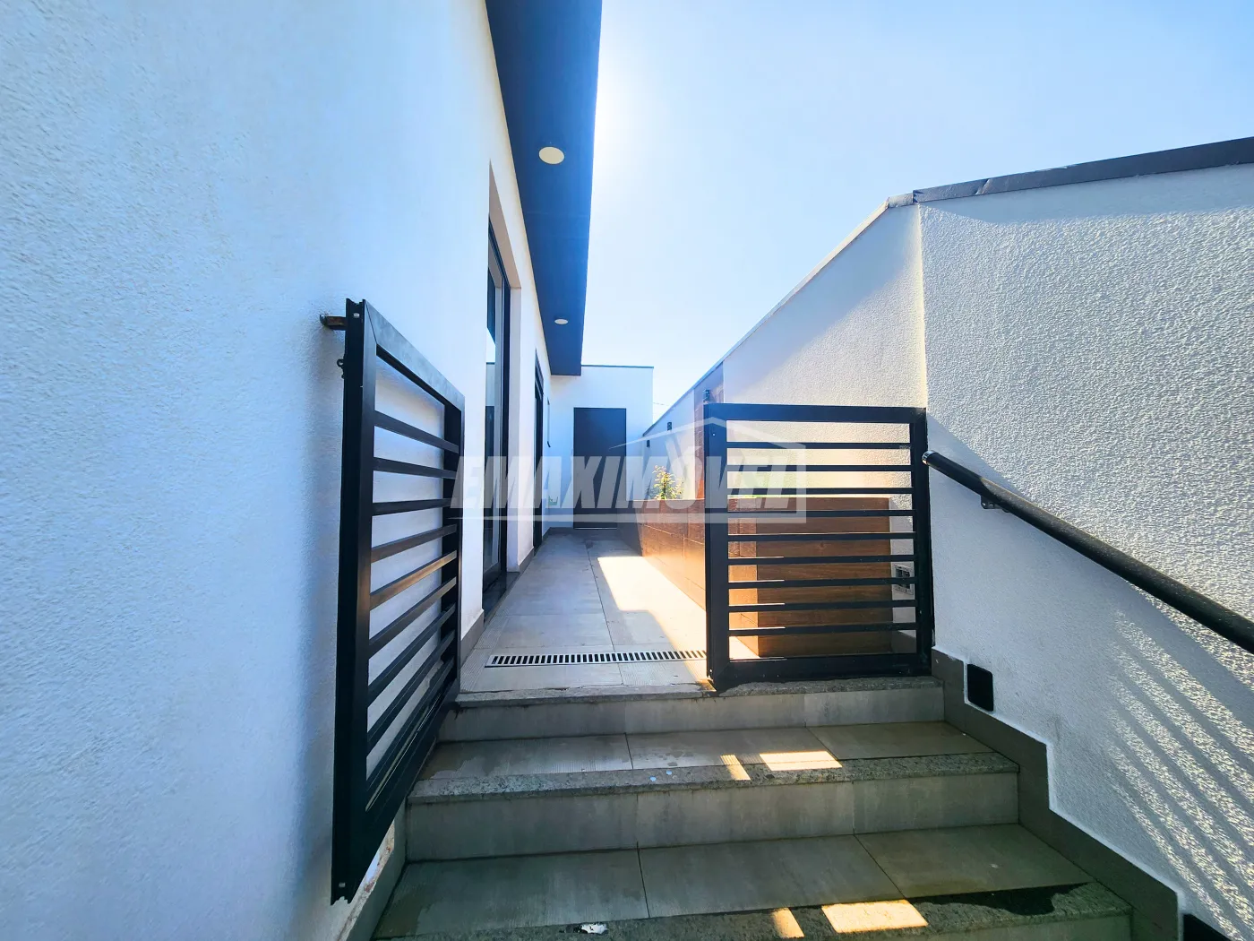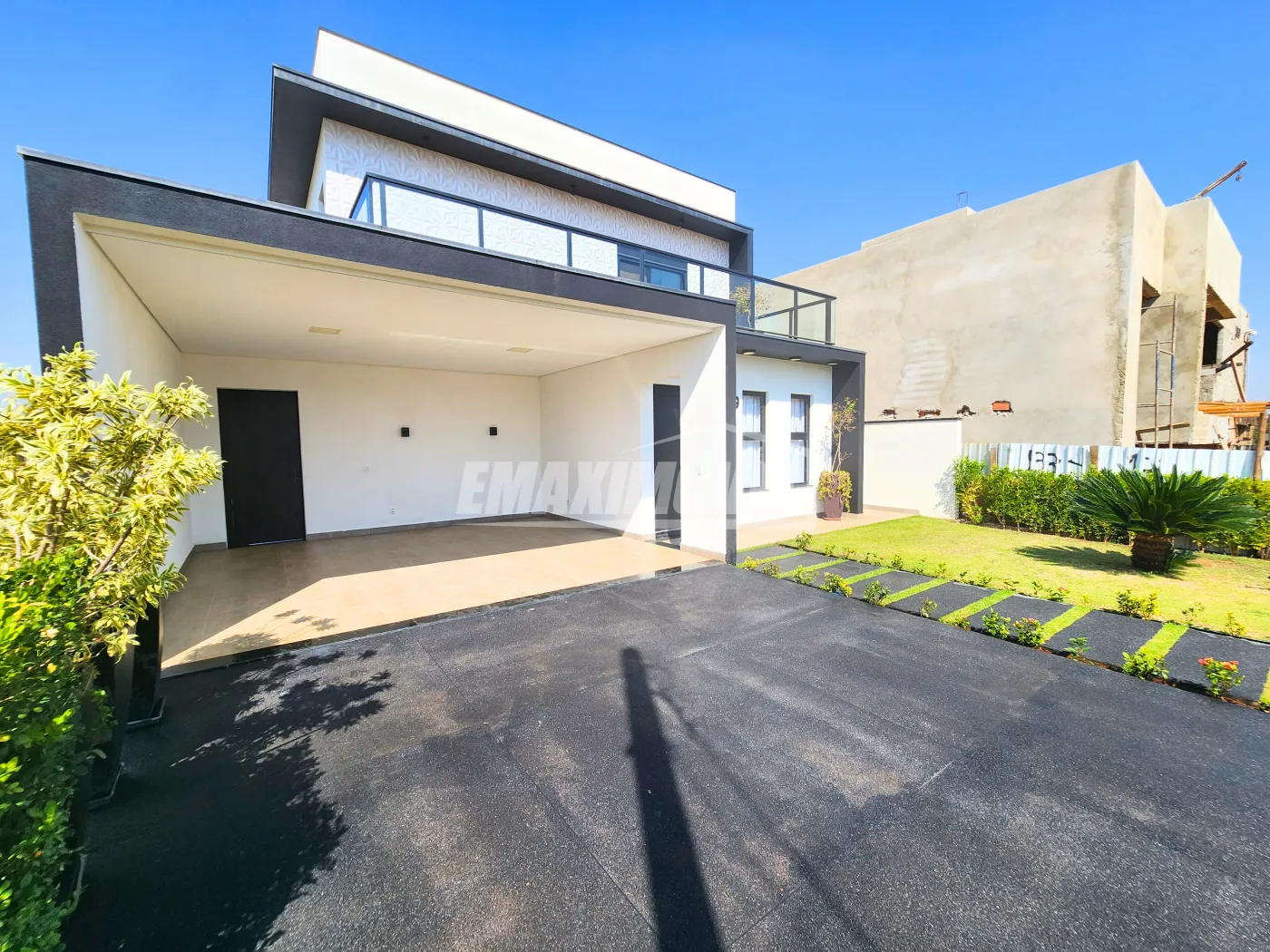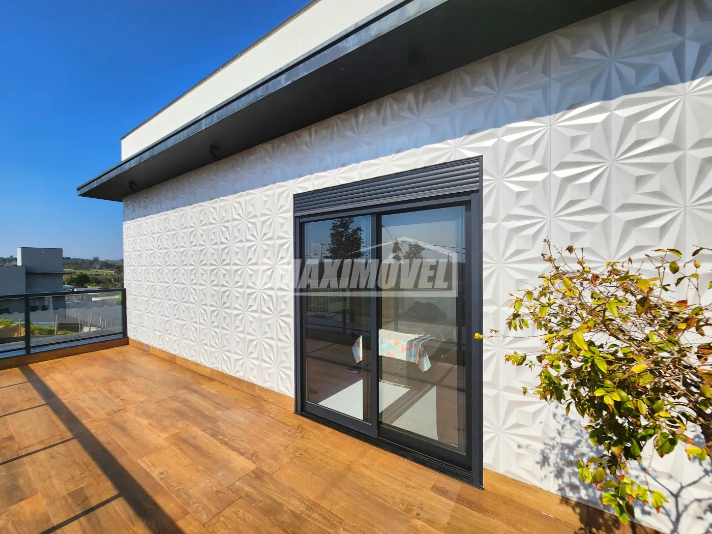 ?Fachada com arquitetura moderna e imponente Chegando a 7 metros de altura ao estilo minimalista, detalhes em revestimentos cristais, painel ripado de alumínio amadeirado, janelas em brise oculto e porta pivotante de 4,60m de altura com fechadura eletrônica, vaga para 4 carros sendo 2 cobertos.