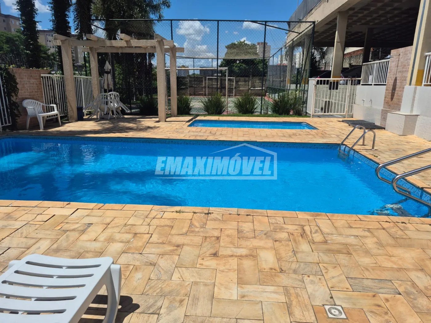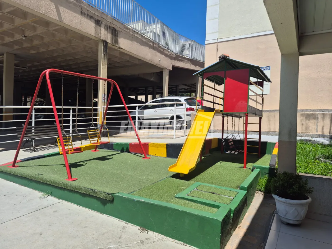 Área de lazer com piscina, quadra poliesportiva, salão de festa, playground, espaço para leitura, prédio sem elevador.