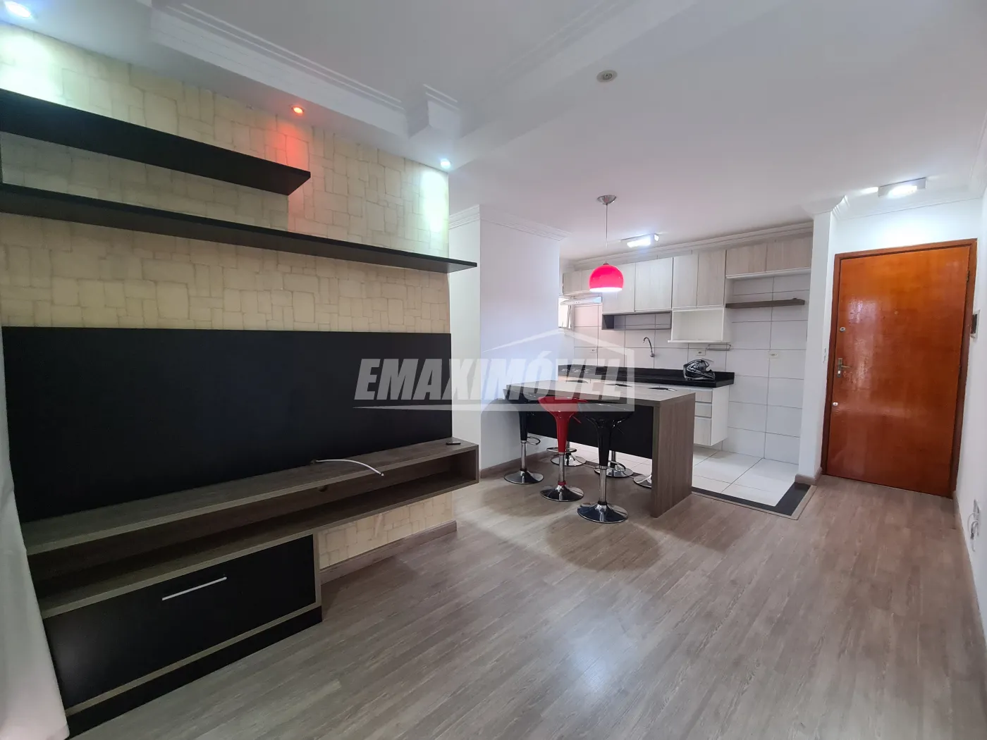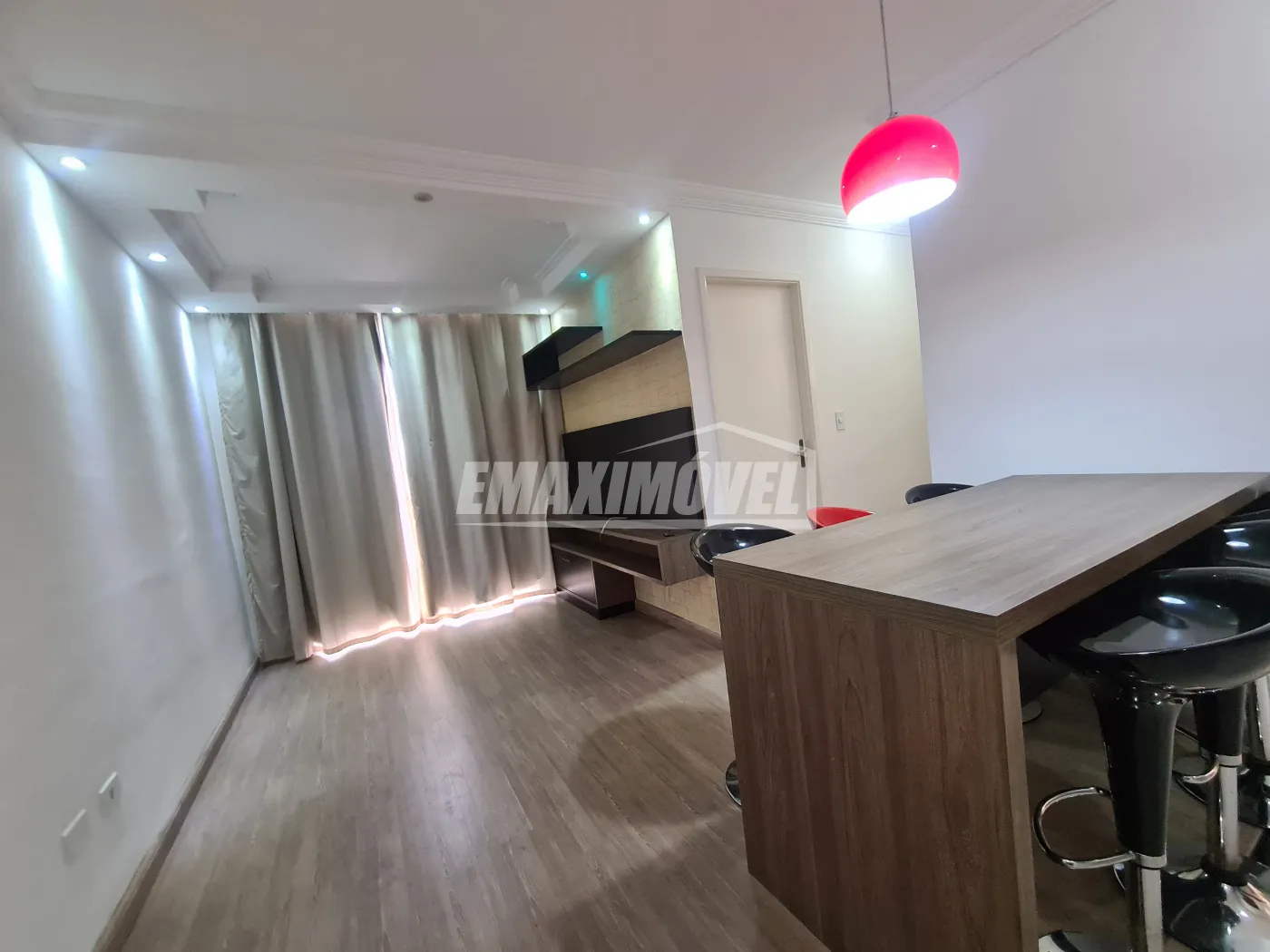 Sala 2 ambientes com painel, mesa com banquetas, lustre, sacada