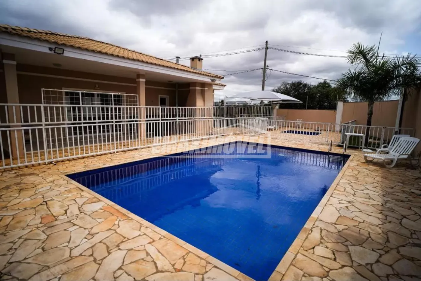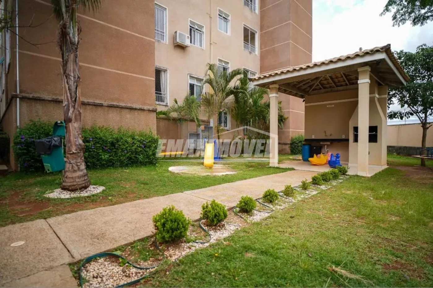Condomínio com piscina, salão de festas e playground.