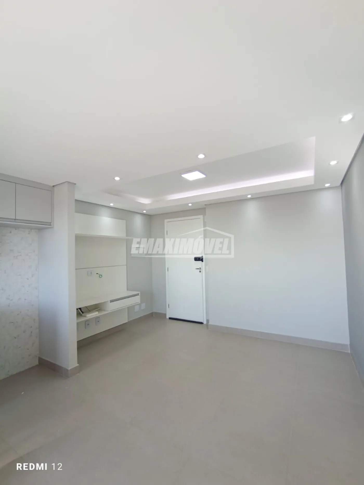 Apartamento moderno com sala equipada com sacada, painel de TV, teto em gesso e iluminação em LED.