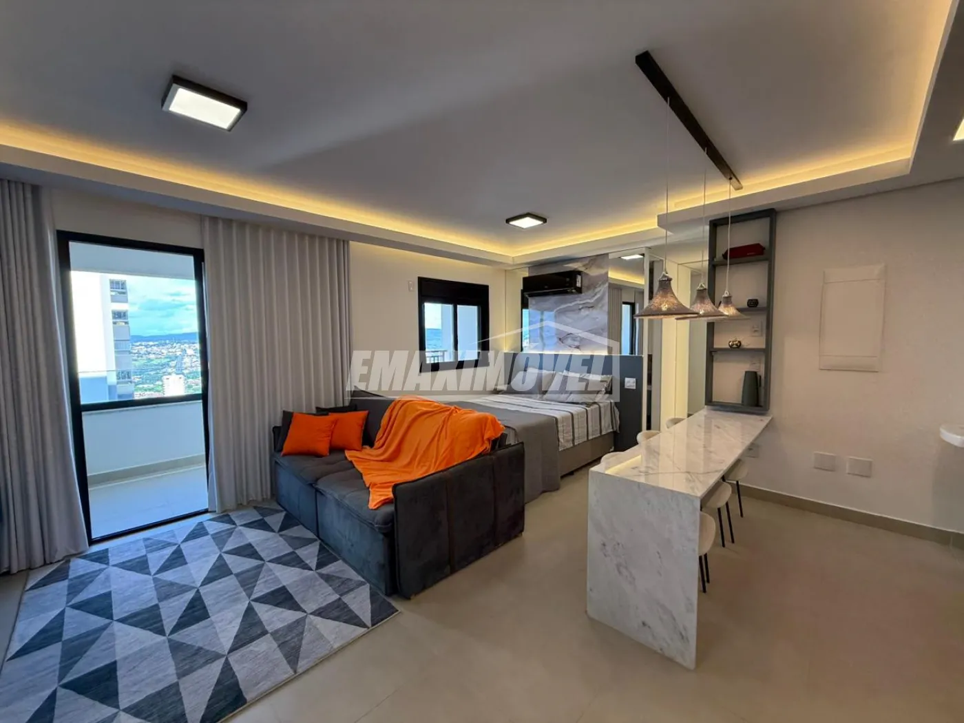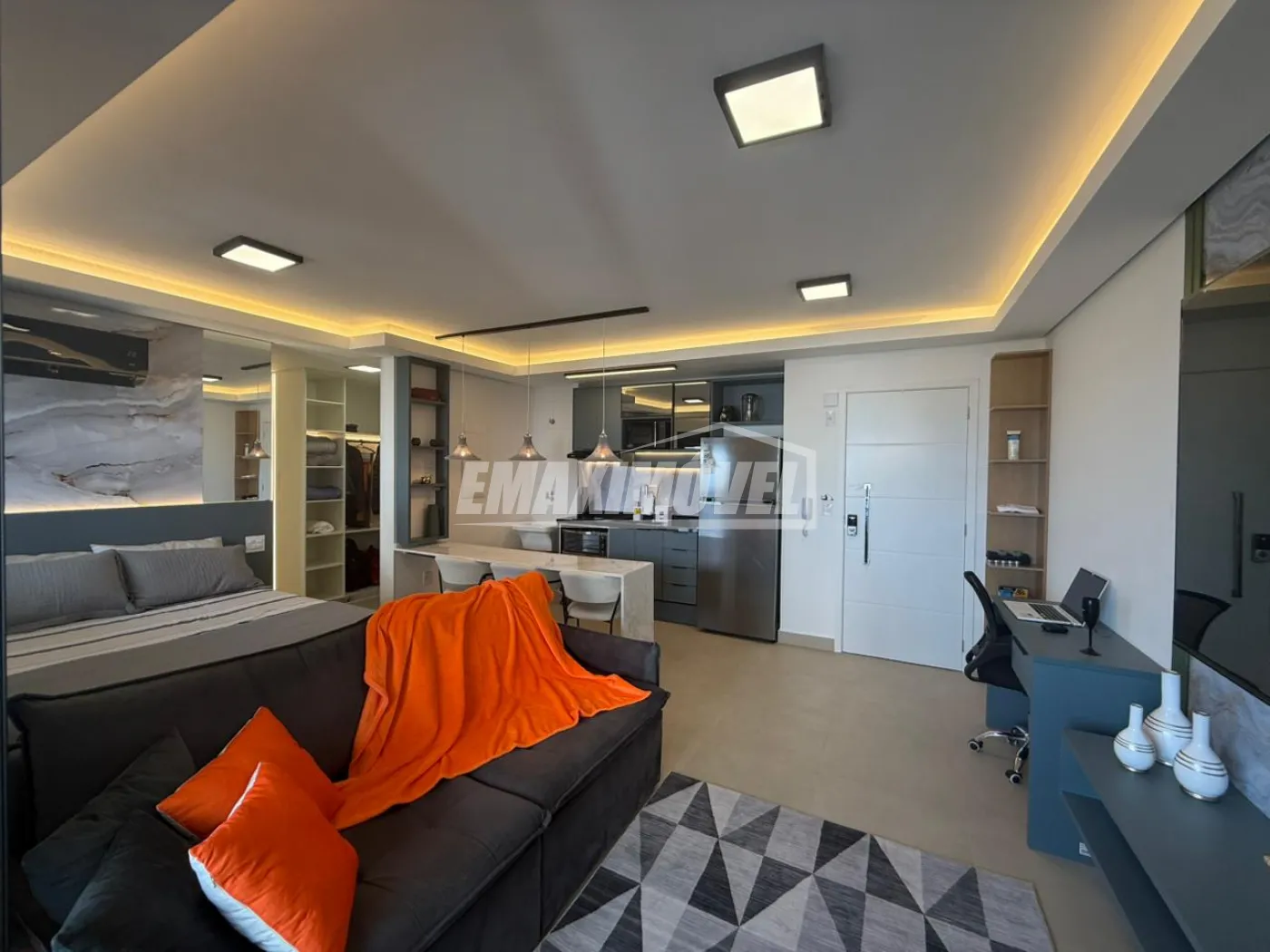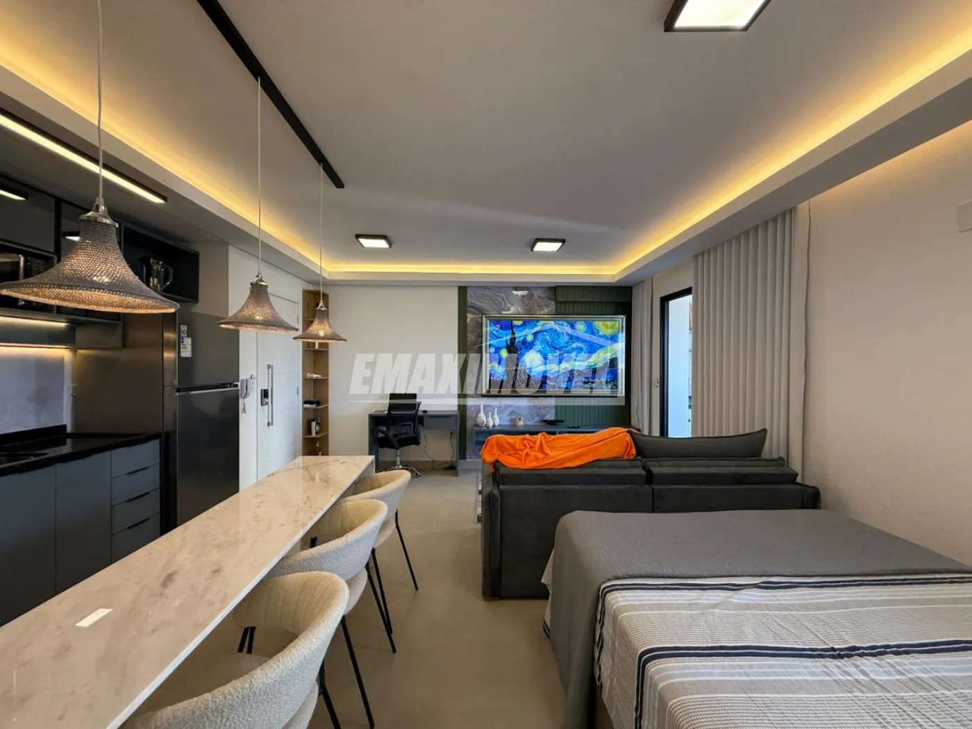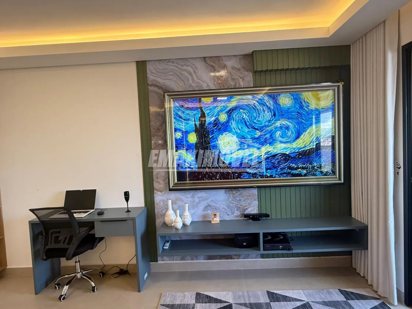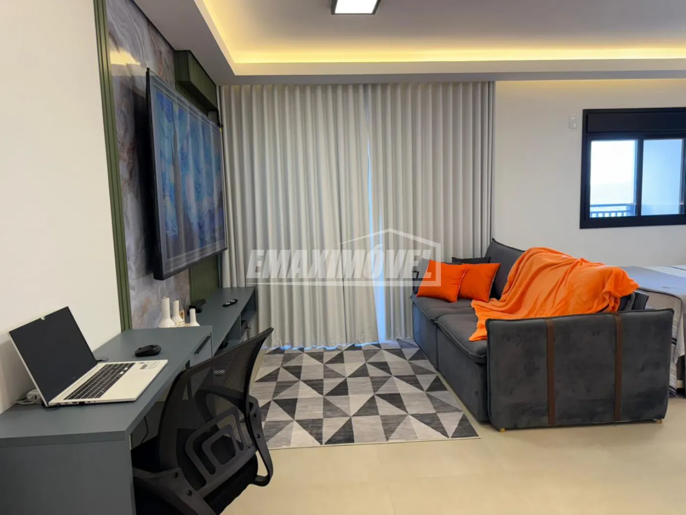 SALA: tv 42` Samsung ( semi-nova ), Rack Tok Stok ( semi nova ), Tapete Cinza clarinho ( semi-novo ), Sofá Cinza claro em linho c/ pés maciço com almofadas ( semi-novo , na foto está com capa ), Cortina Bege Clarinho e Varão, Mesa de jantar cinza claro 1,00 x 1,00 e cadeiras cinza claro ( pés maciço ambas ) na foto as cadeiras estão com capas, Aparador Rústico em ferro dourado e tampo em vidro, Poltrona Bege claro com pés dourado ( nova ), Espelho 1,50 x 1,00, Lustres em LED e Cristais e Quadros.