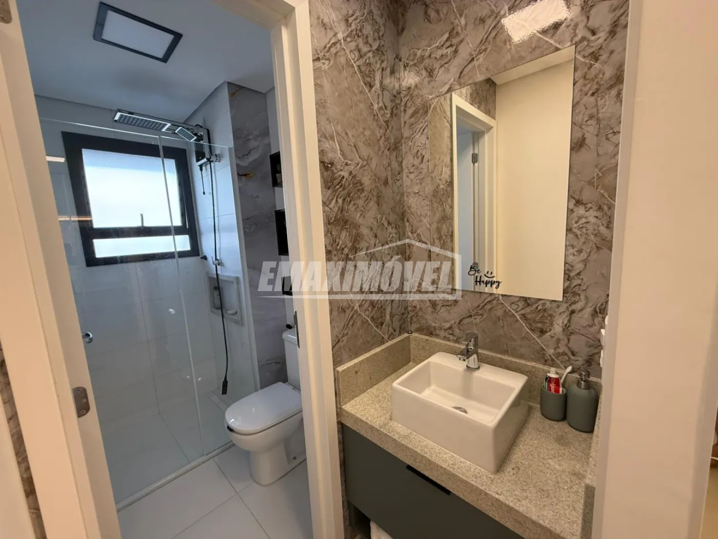 BANHEIRO SOCIAL: Box banheiro, Chuveiro Ducha Forte Lorenzetti Branco, Espelho Grande, Gabinete e cuba, Torneira nova, Suporte Papel higiênico na cor cromada, Cesto de lixo na cor cromada, Suporte de sabonete de canto em vidro, Tapete cinza claro, Suporte cromado de toalha de rosto.