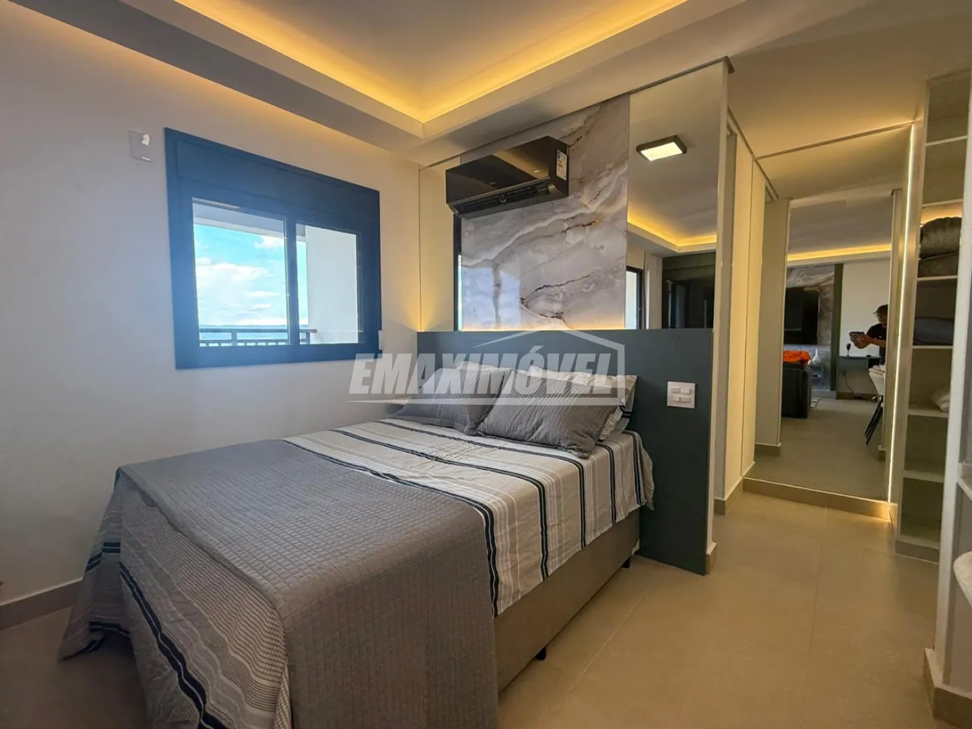 QUARTO CASAL: Guarda roupa MODULADO Todeschini ( tamanho bom ) com espelho em uma das portas, Ventilador de teto c/ lâmpada ( novo ), Tv 32` Samsung ( semi-nova ) c/ uma Rack tipo guarda trecos, Cortina Persiana de correr na cor bege Claro, Ar Condicionado Portátil Springer c/ 12.000 BTUs, Cama box Queen c/ cabeceira na cor do Guarda roupa + colchão, Quadro.