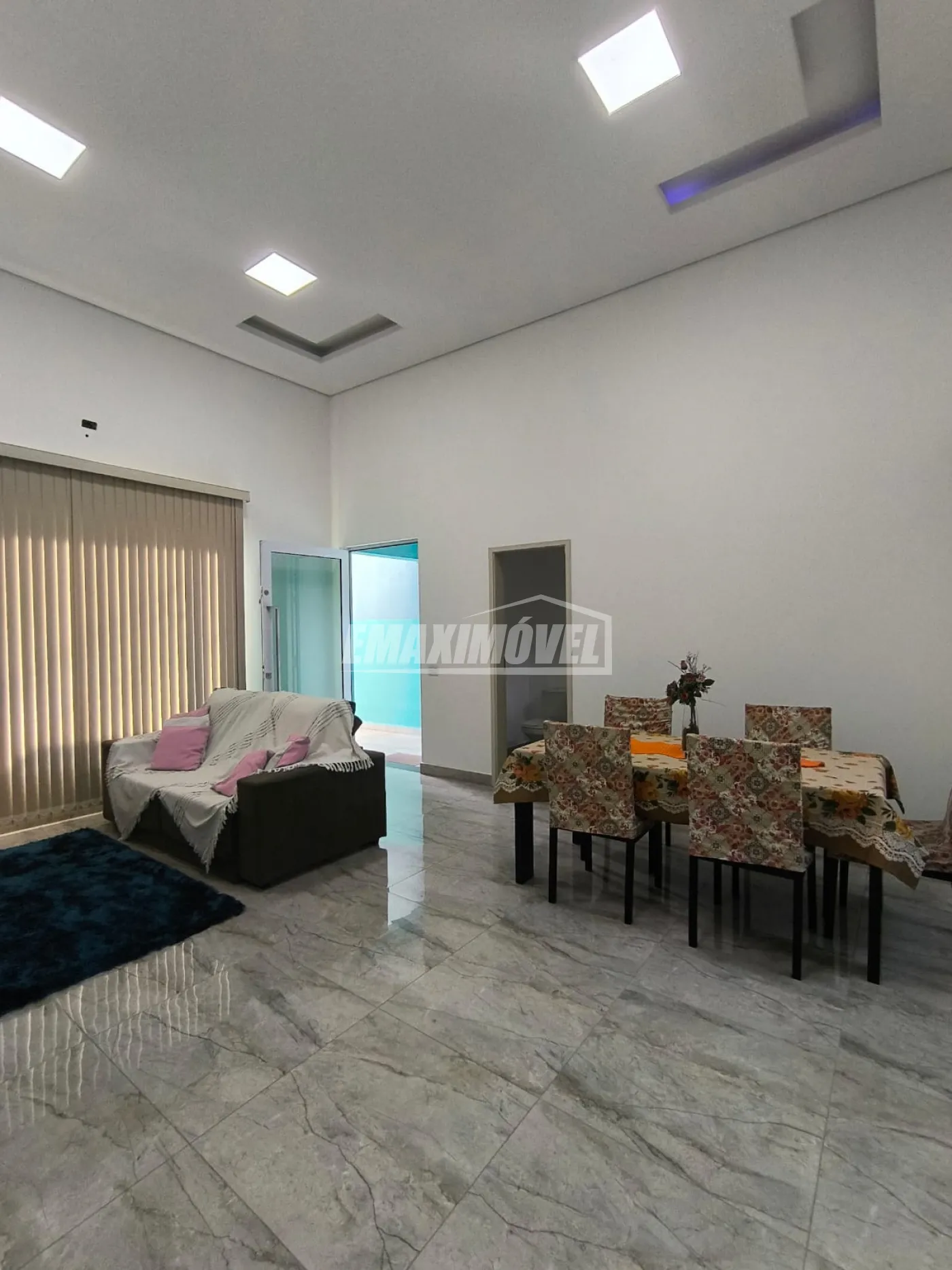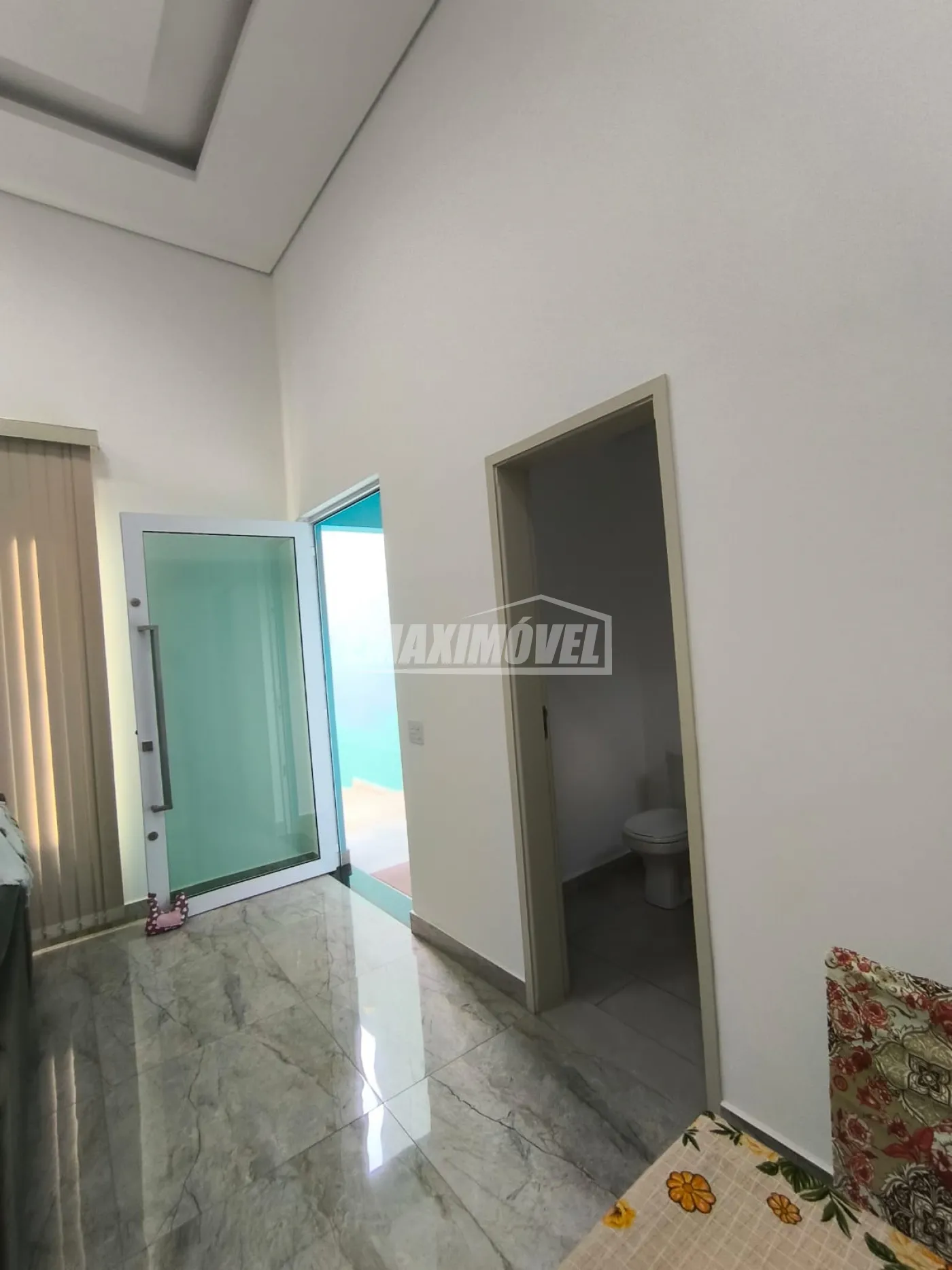 Sala ampla dois ambientes (TV e Jantar), pé direito 5 metros, telhas sanduíche tornando respectiva sala com acústica perfeita assim como temperatura agradável, toda preparação já disponível para ar condicionado, porta social diferenciada de vidro verde, forro de gesso diferenciado e iluminação planejada com variação de cores, excelente piso porcelanato perfeitamente assentado. Toalete ideal com torneira estilosa e espelho harmonioso sendo perfeita e providencial para familiares e convidados.
