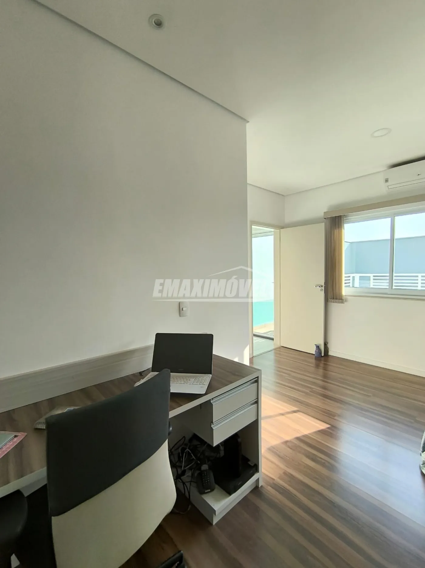 Suíte 3 Superior: ar condicionado instalado, janela imensa, armário planejado com muito estilo, mesa dedicada para escritório.