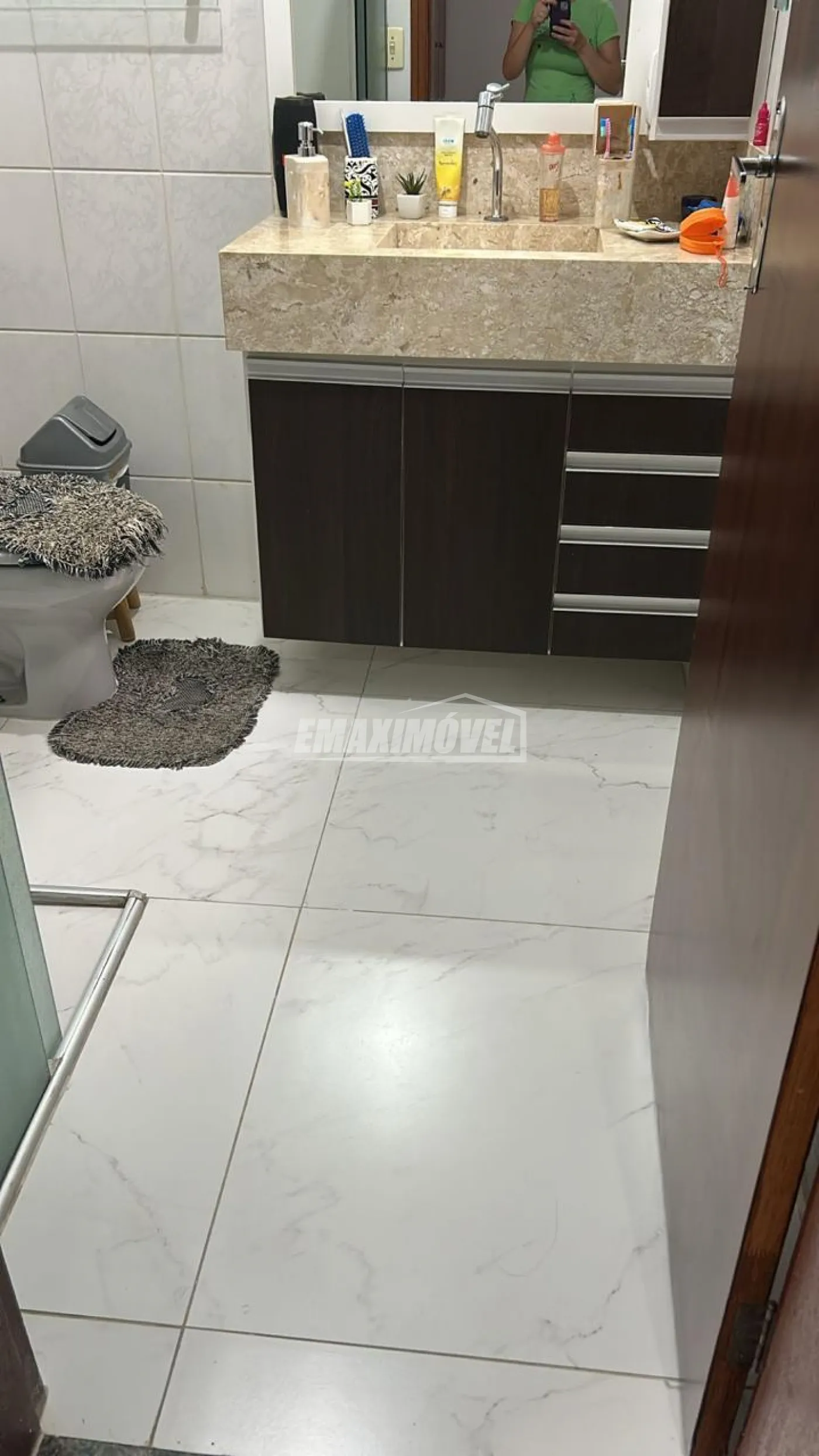 Banheiro com gabinete e box acrílico, piso frio