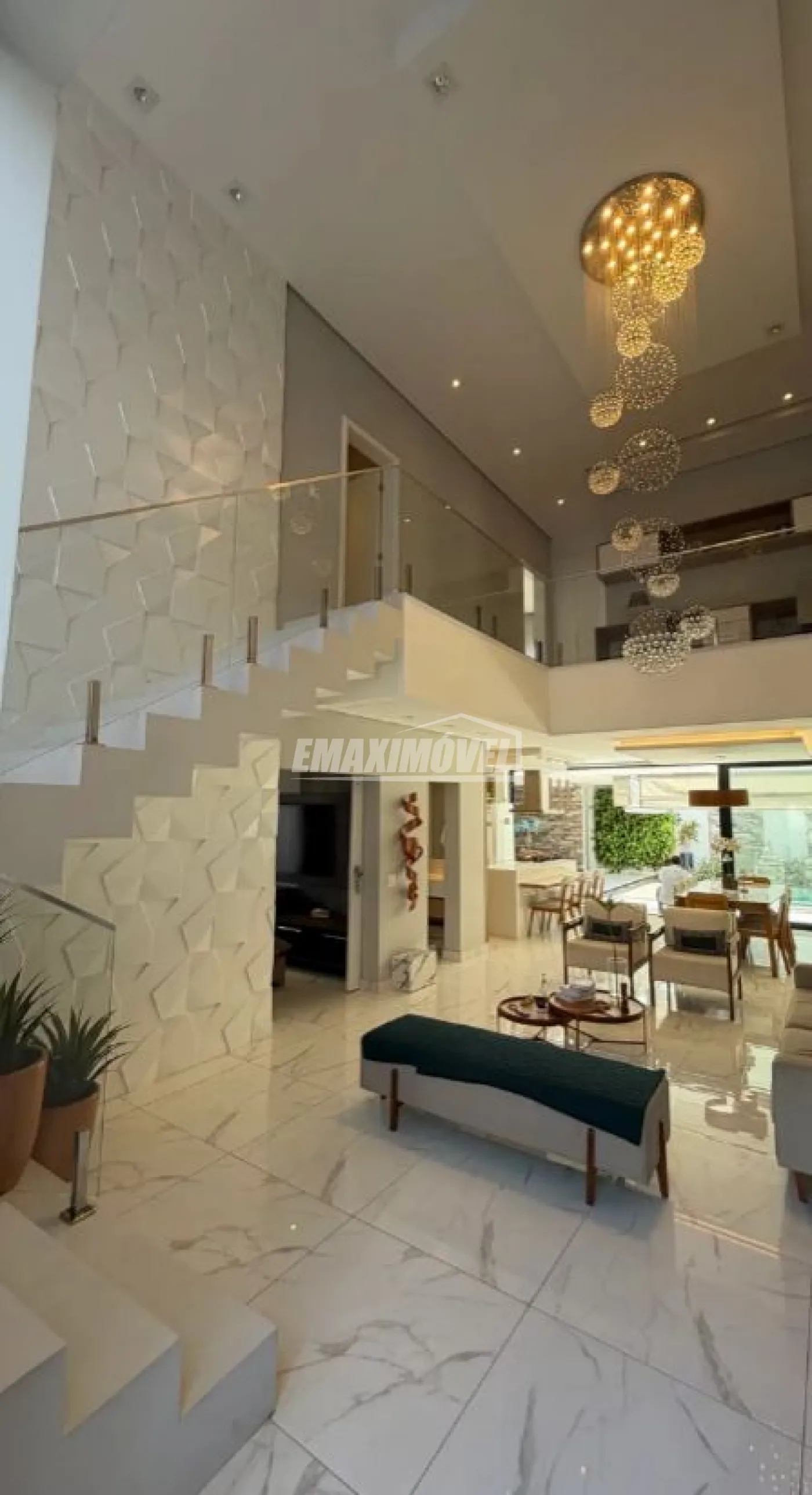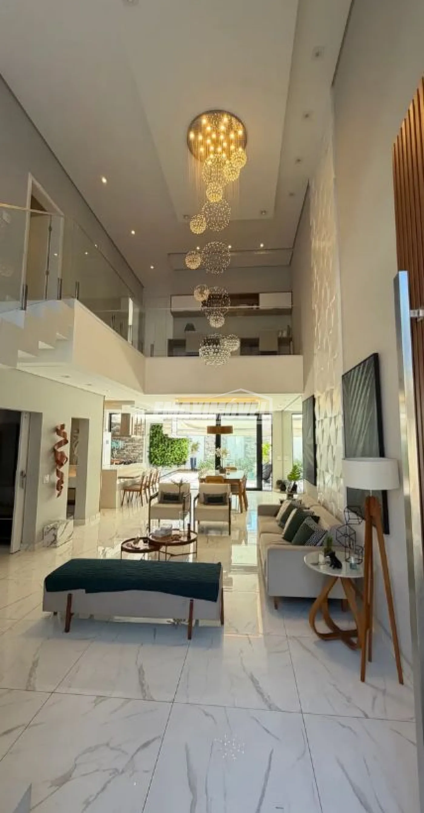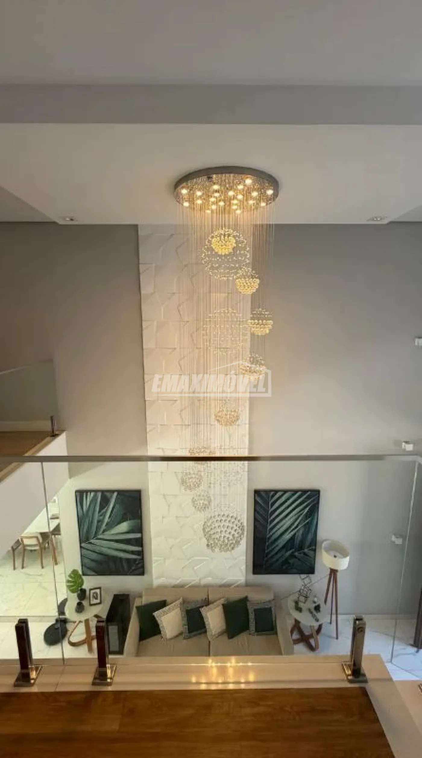 Sala pé direito duplo com lustre em cristal e escada em pedra e vidro