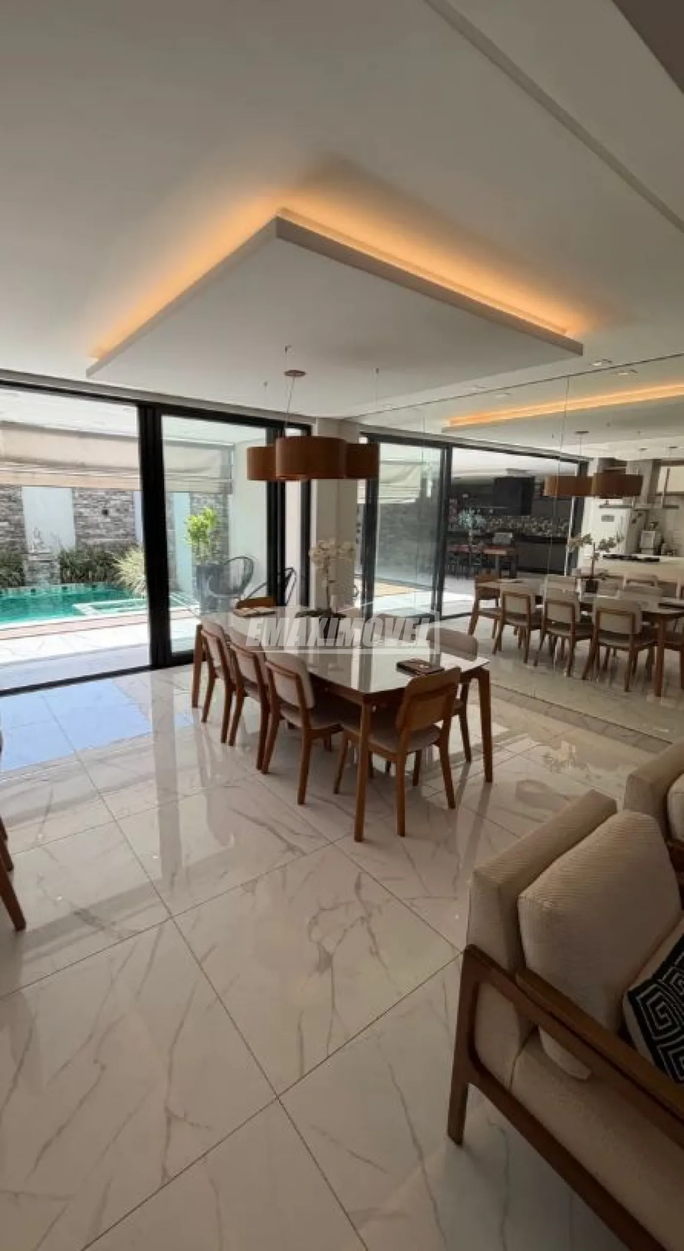 Área gourmet com piscina e jacuzzi aquecidas, som e iluminação integrada no teto.