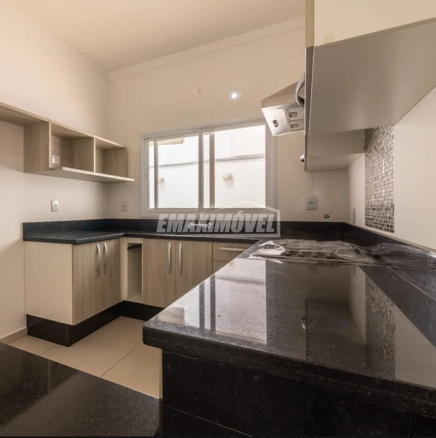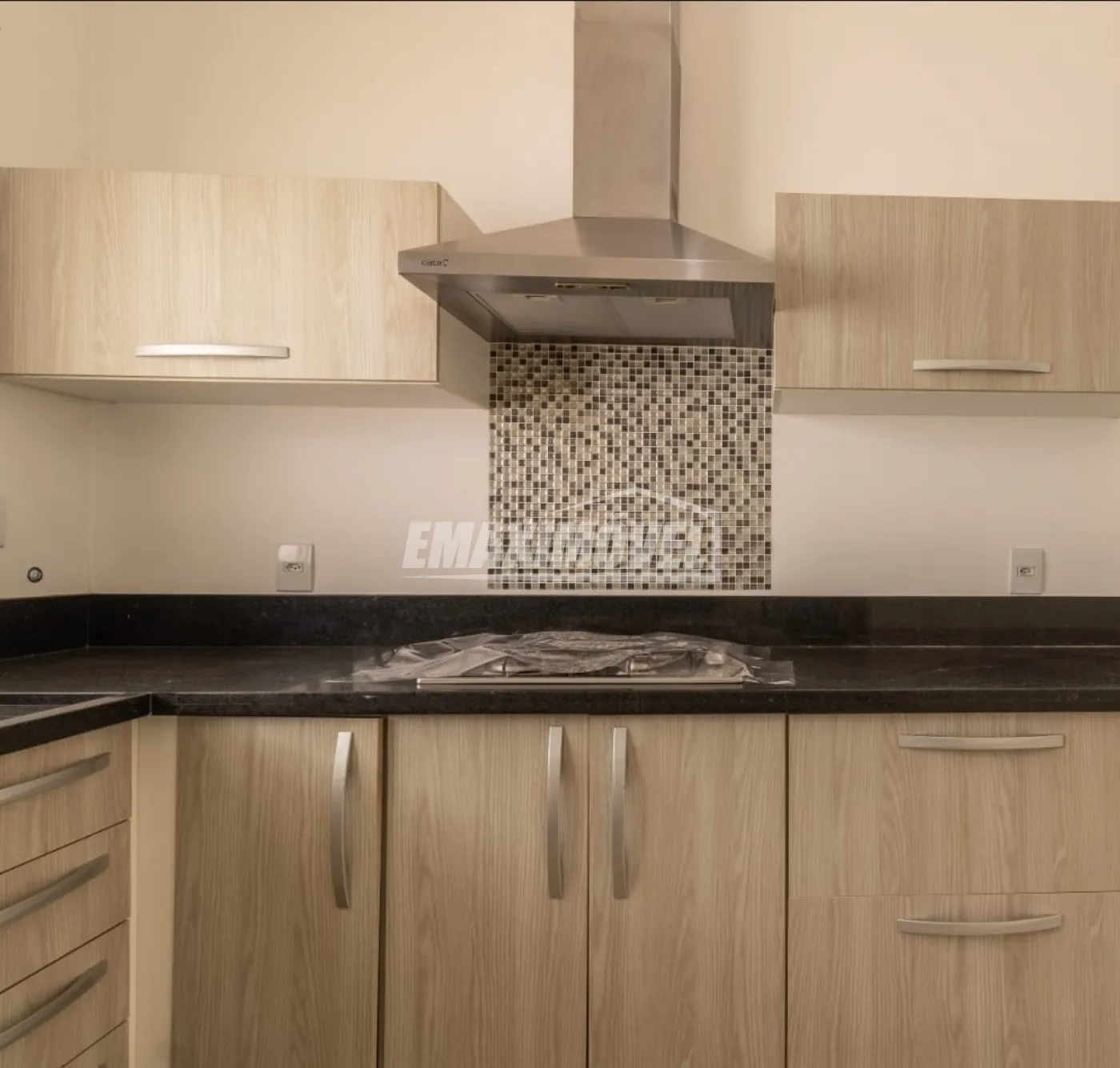 - Cozinha equipada com armários, fogão e coifa