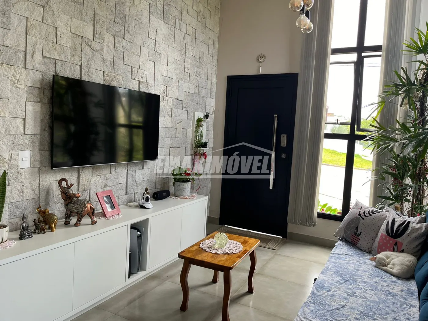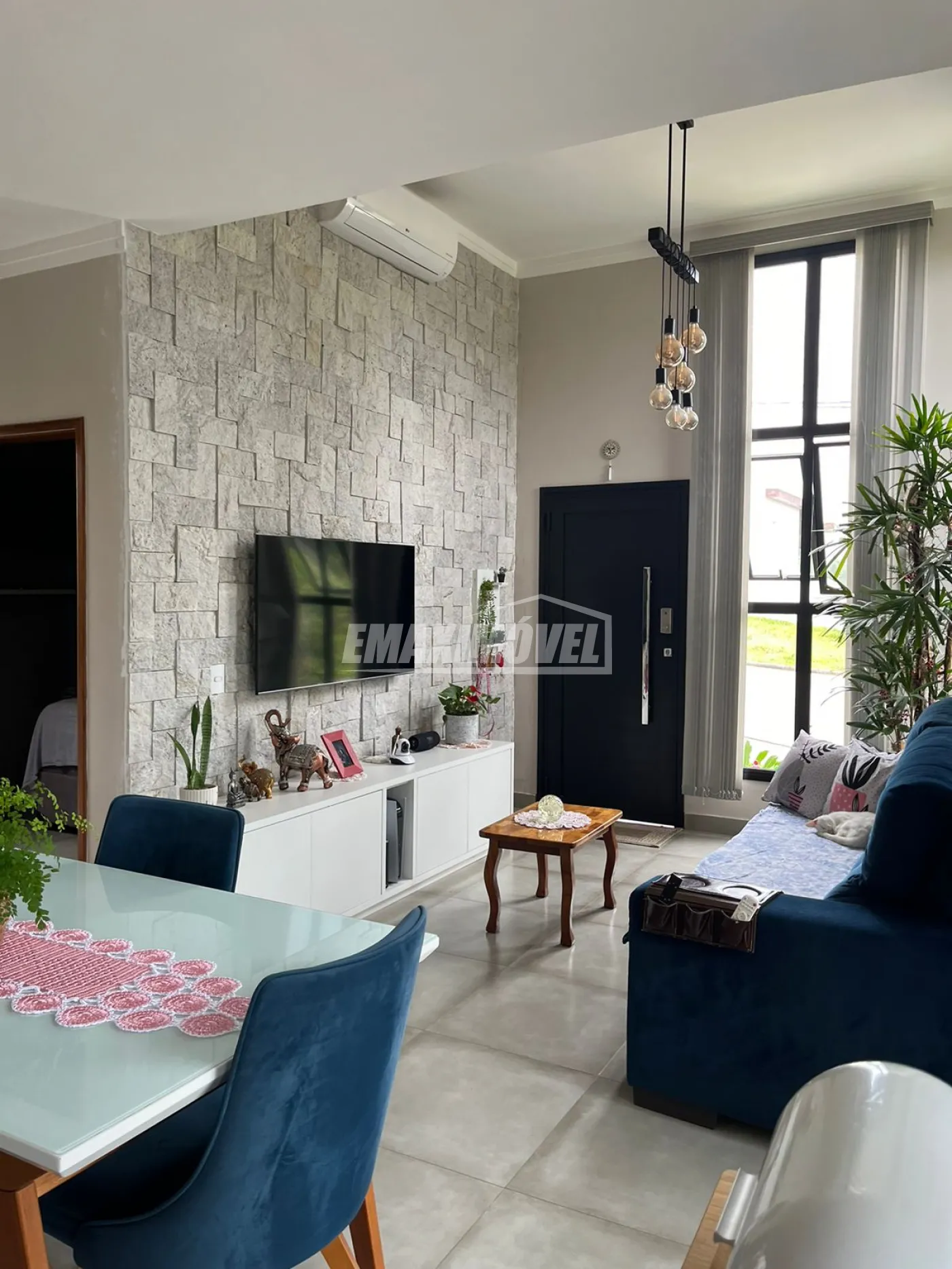 Sala com rack, pedras na parede, iluminação moderna e ar condicionado inteligente (controlado pelo celular em qualquer local que esteja), sofa e meda com cadeiras de excelente qualidade.