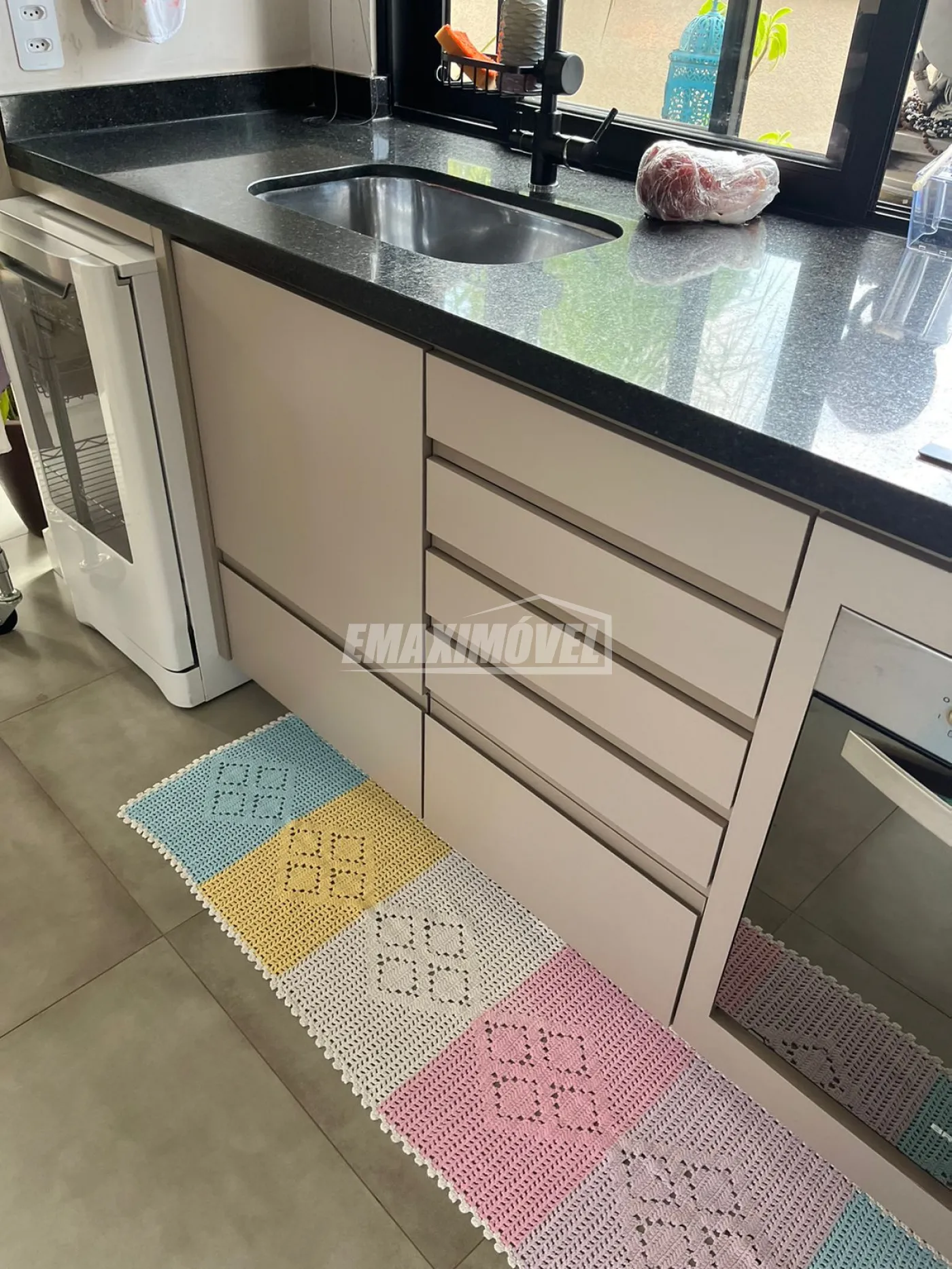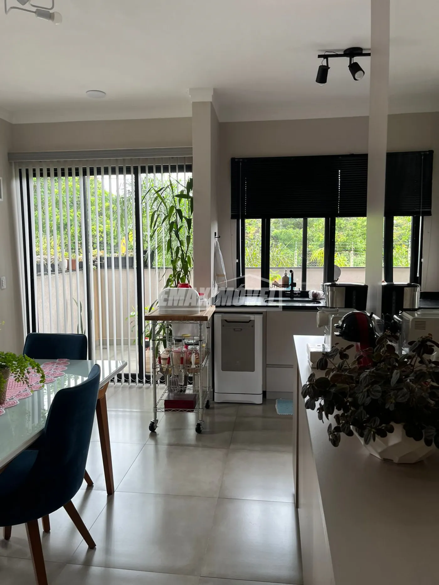 Cozinha e sala com armários feitos sob medida.