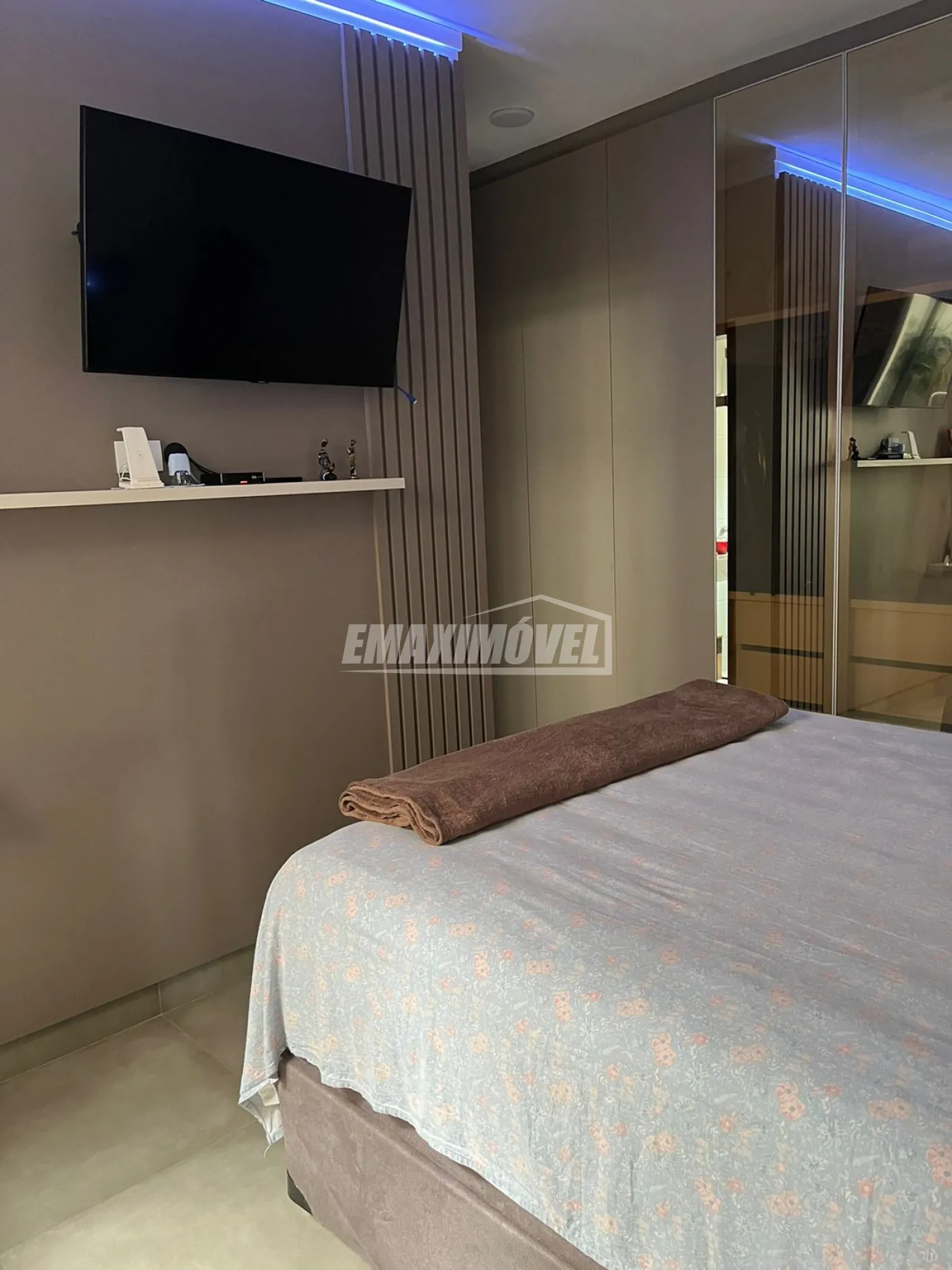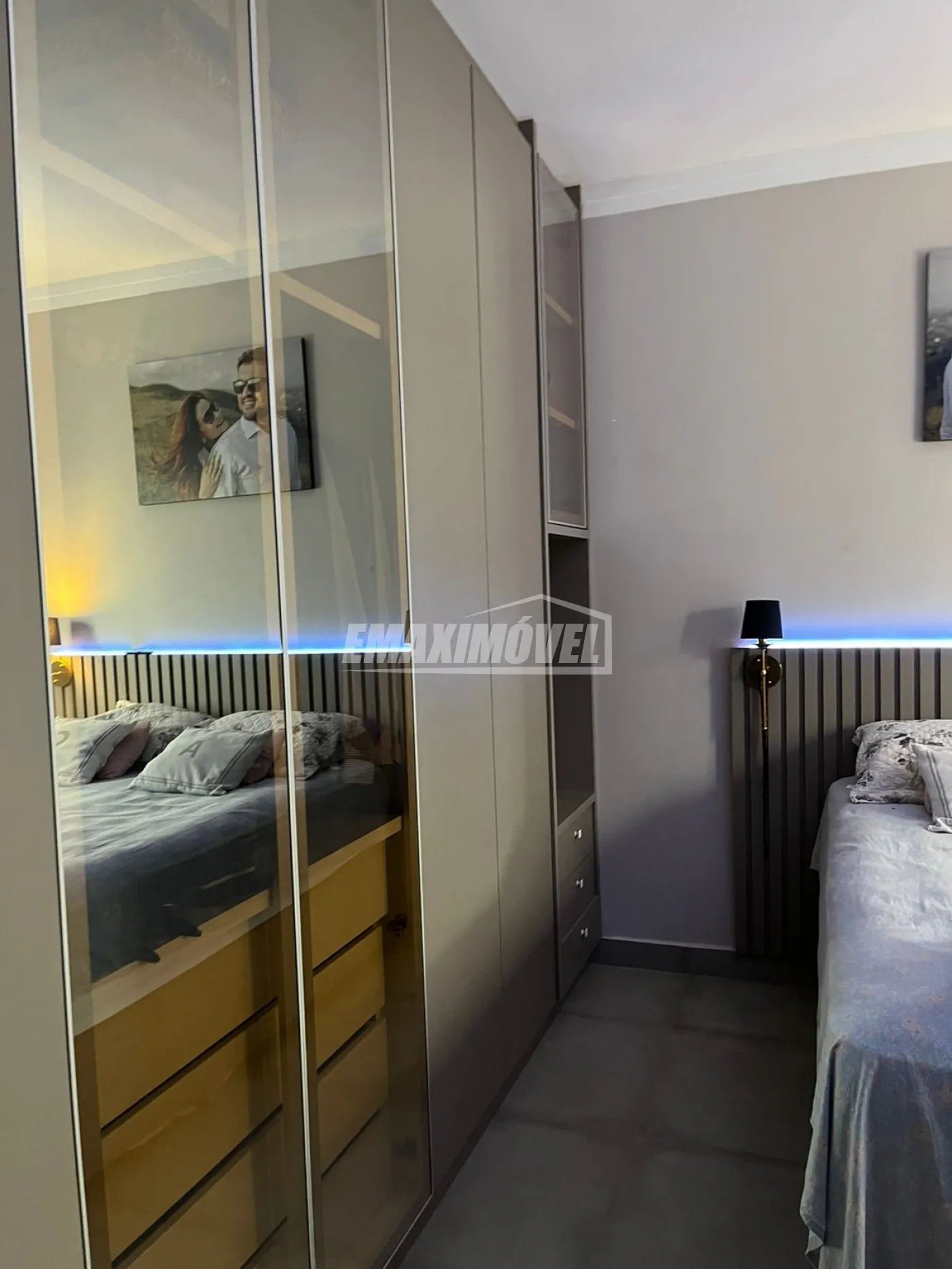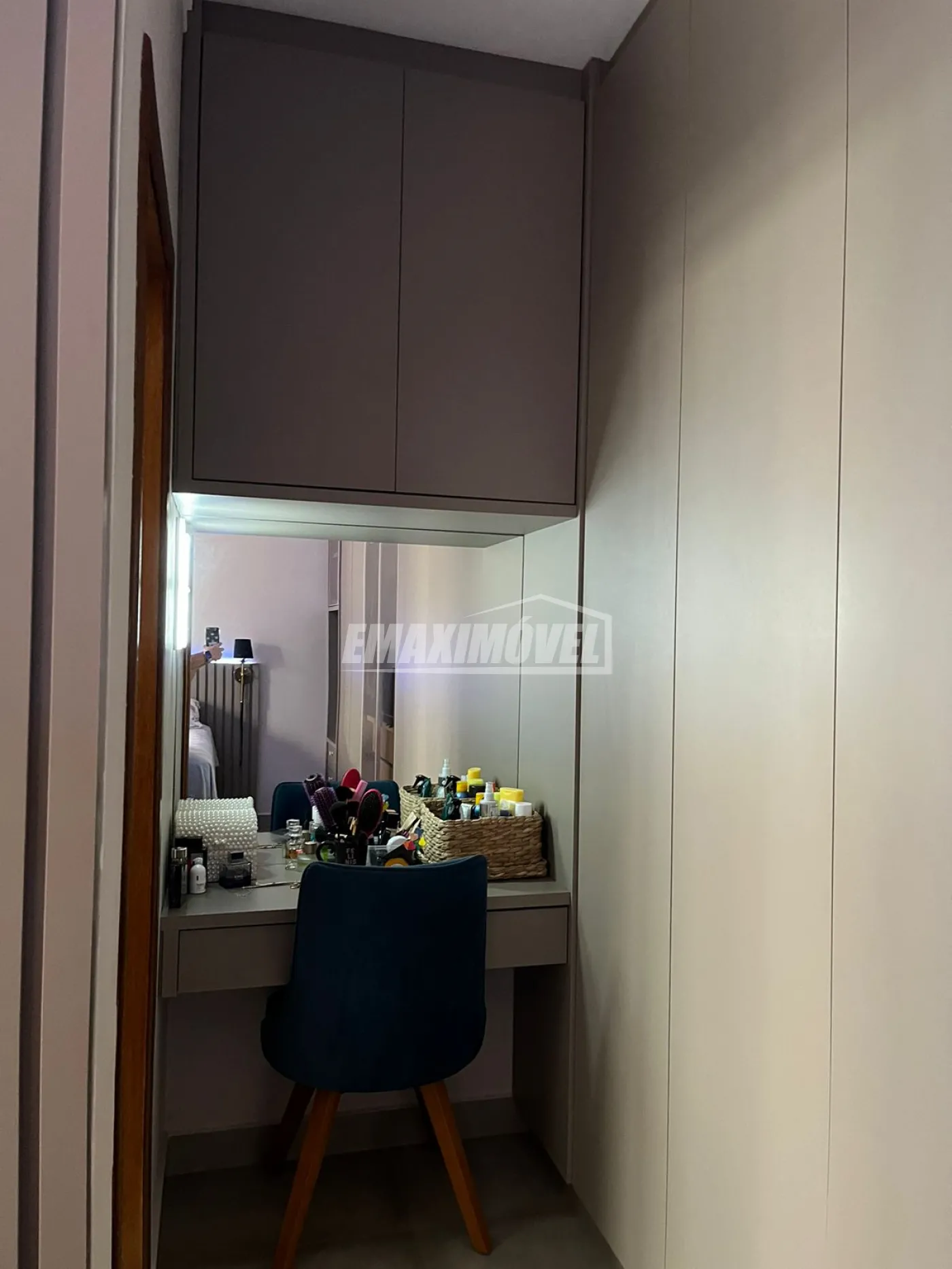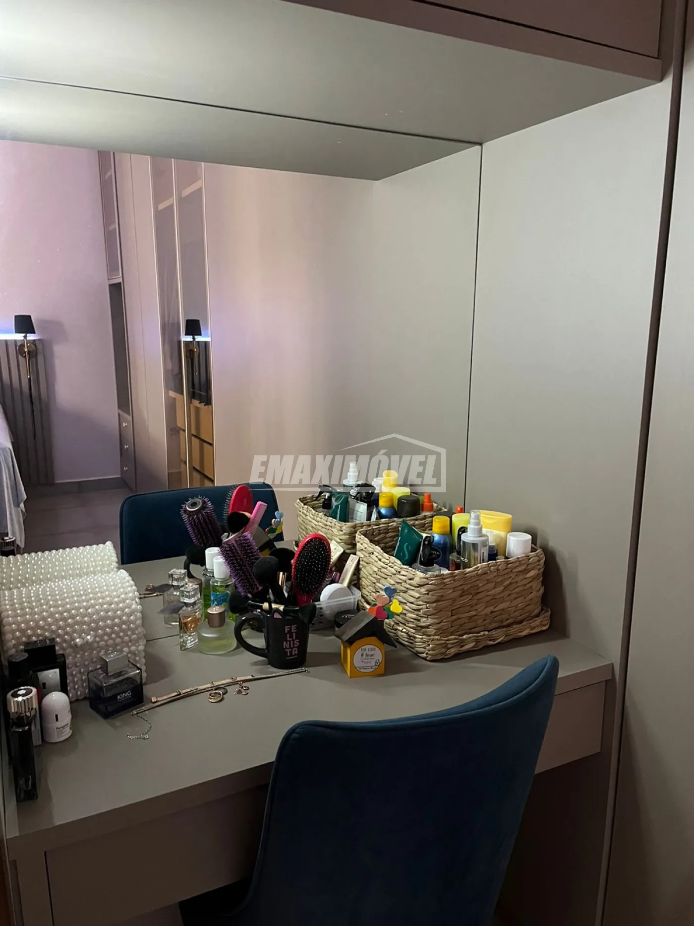 Suíte com guarda roupas feito sob medida e penteadeira e persiana, cama de casal queen size com box baú.