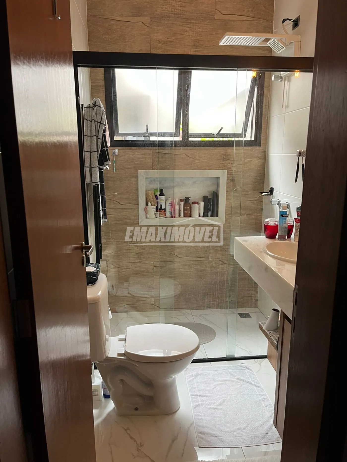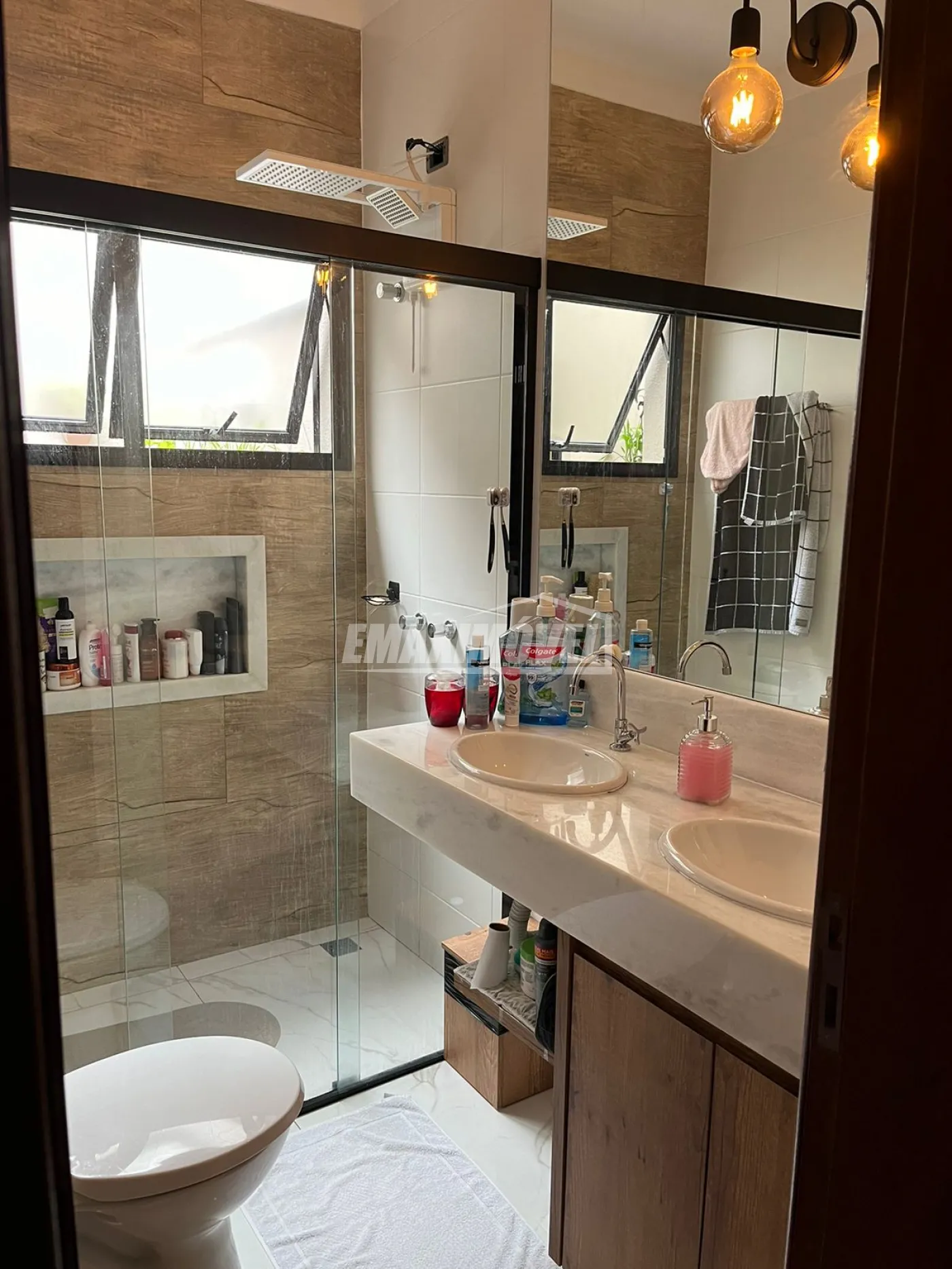 Banheiros com armários sob medida, chuveiros, box, espelhos e suíte com ducha higiênica.