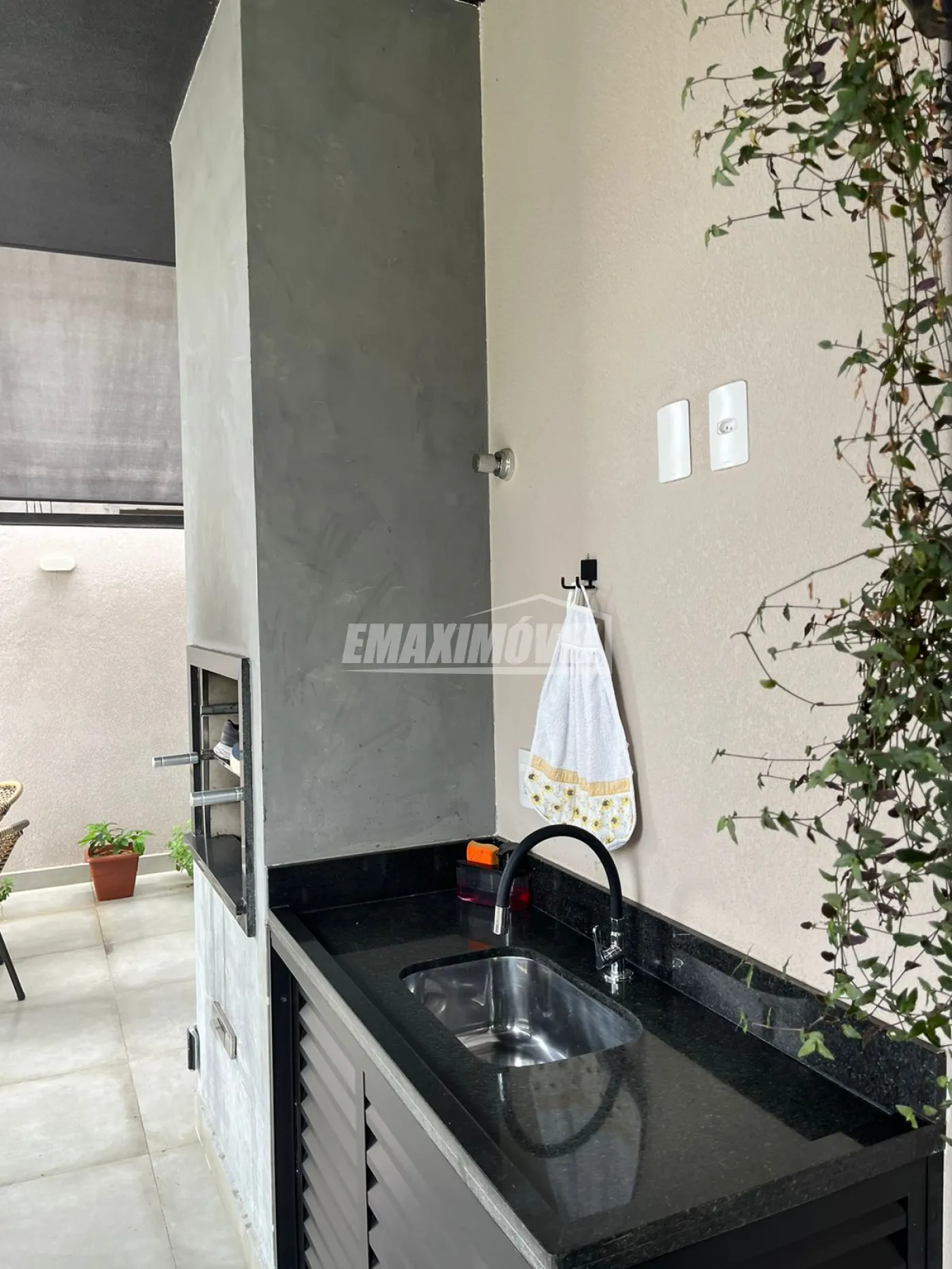 Churrasqueira com pia e armário.