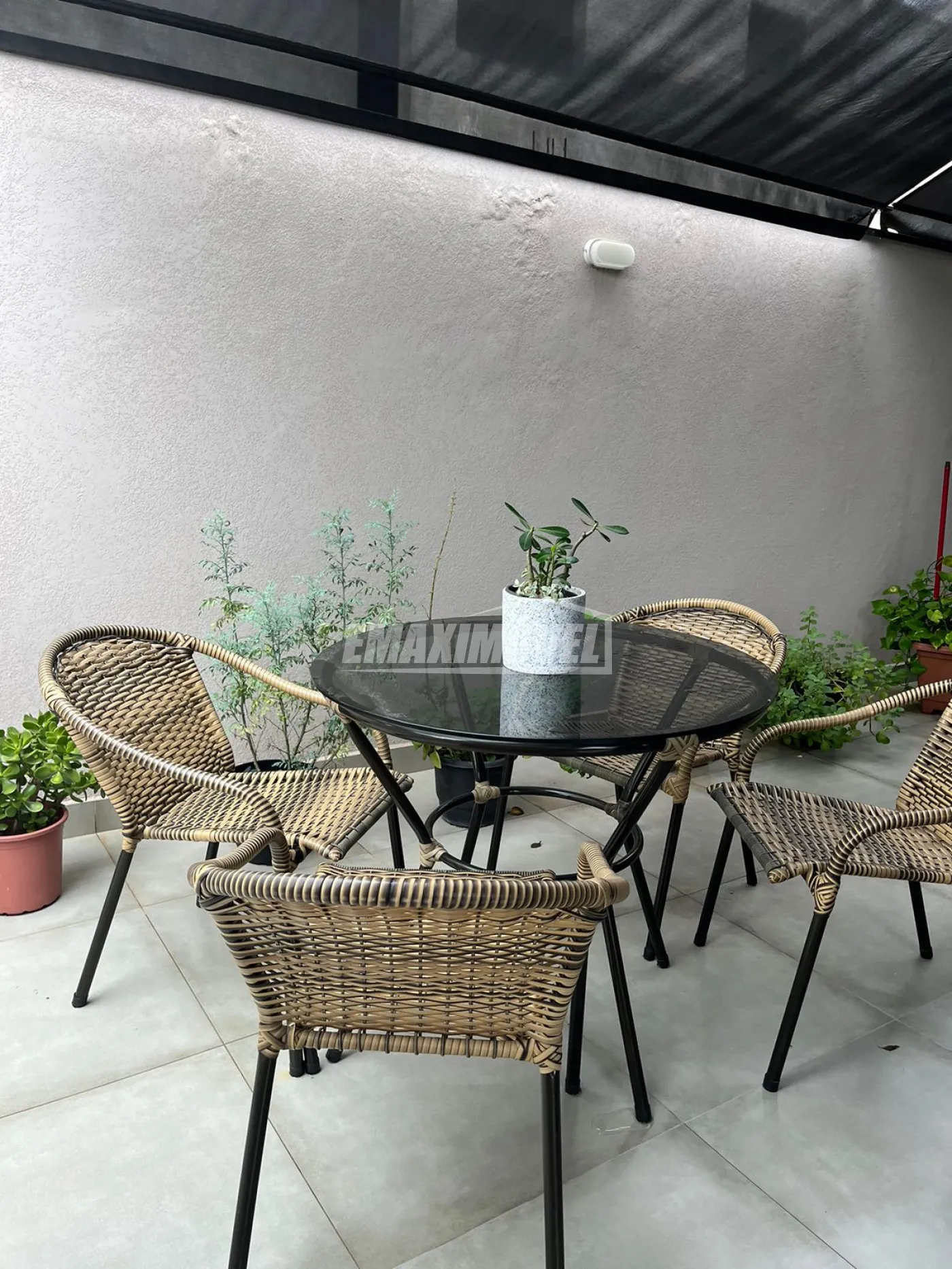Area de churrasco com mesa e cadeiras, e namoradareia e 2 cadeiras estofadas.