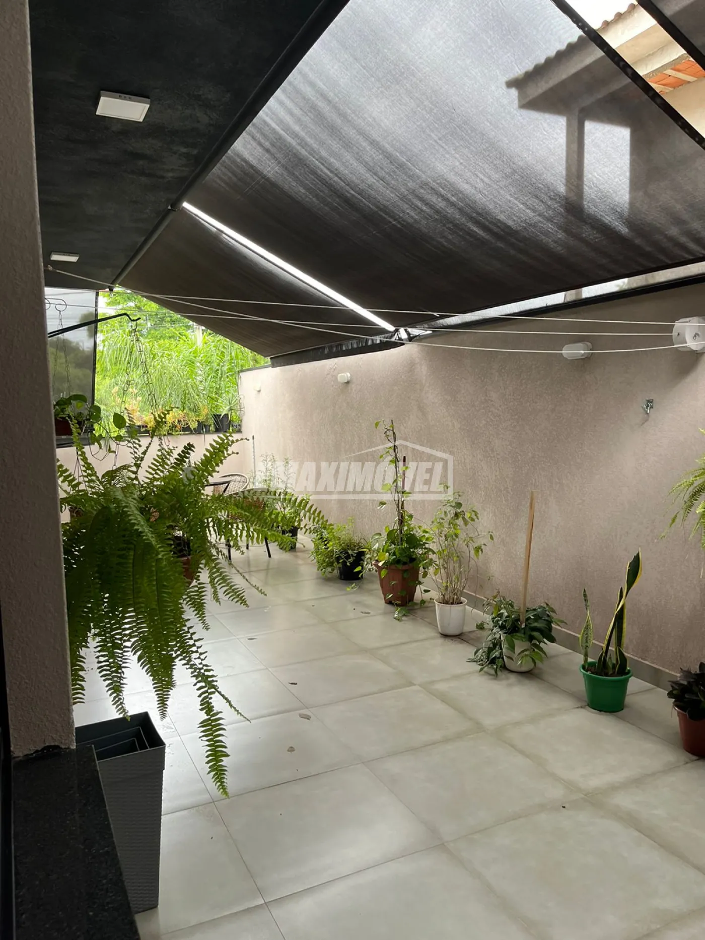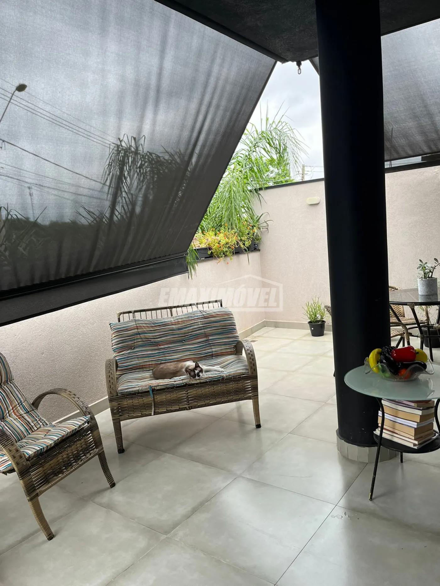 Toldos para proteção solar removíveis na área externa e área de sol com teto retrátil.