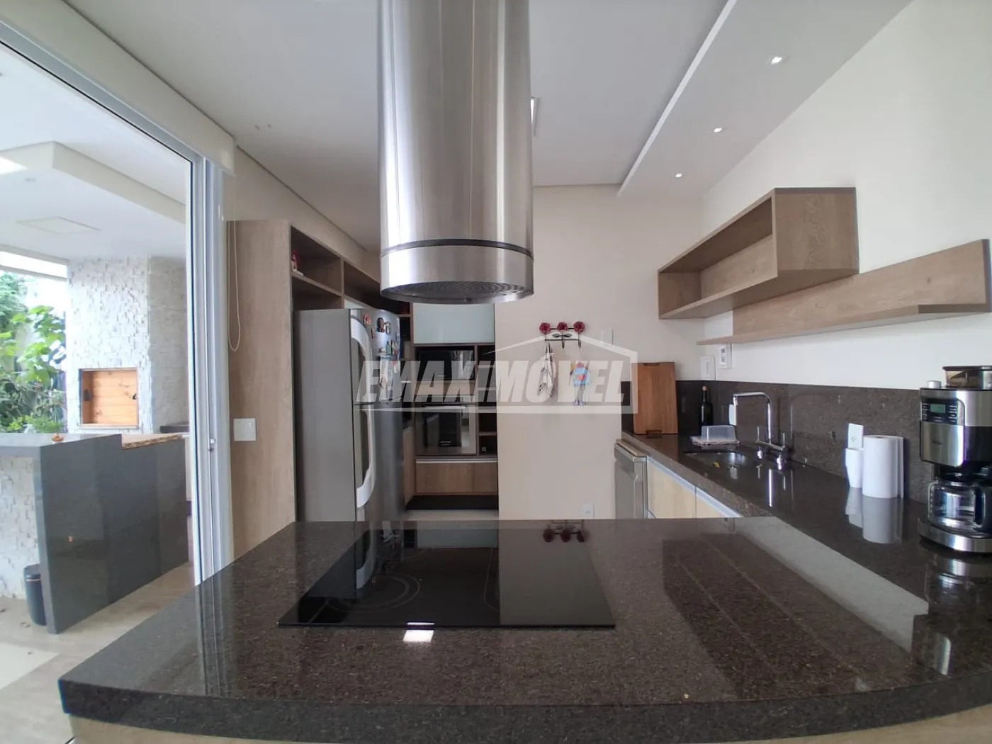 Cozinha totalmente planejada com armários, cooktop de indução, forno elétrico, coifa, geladeira, máquina de lavar louças