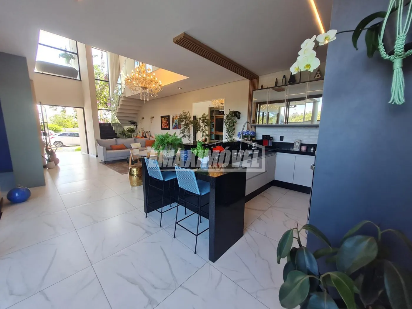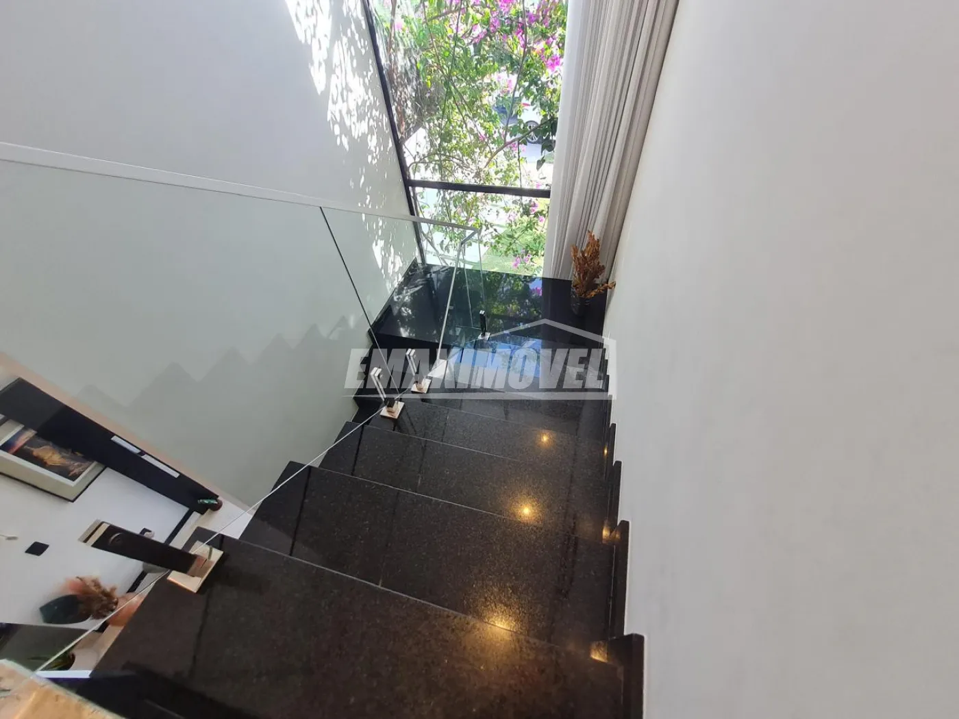 Escada e bancadas em granito São Gabriel. Parte de baixo, garagem e sacadas em porcelanato.