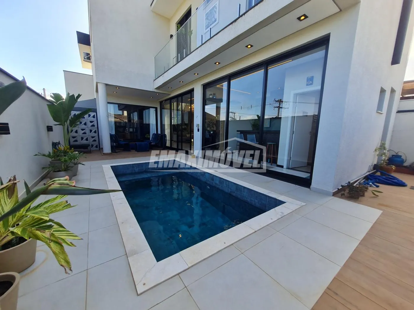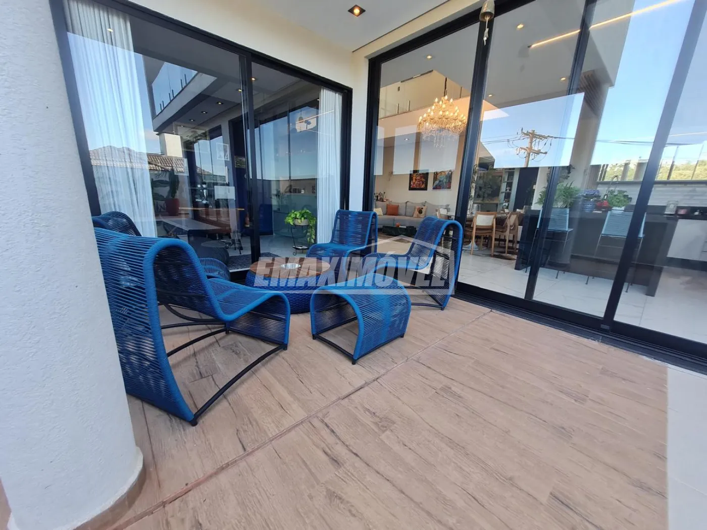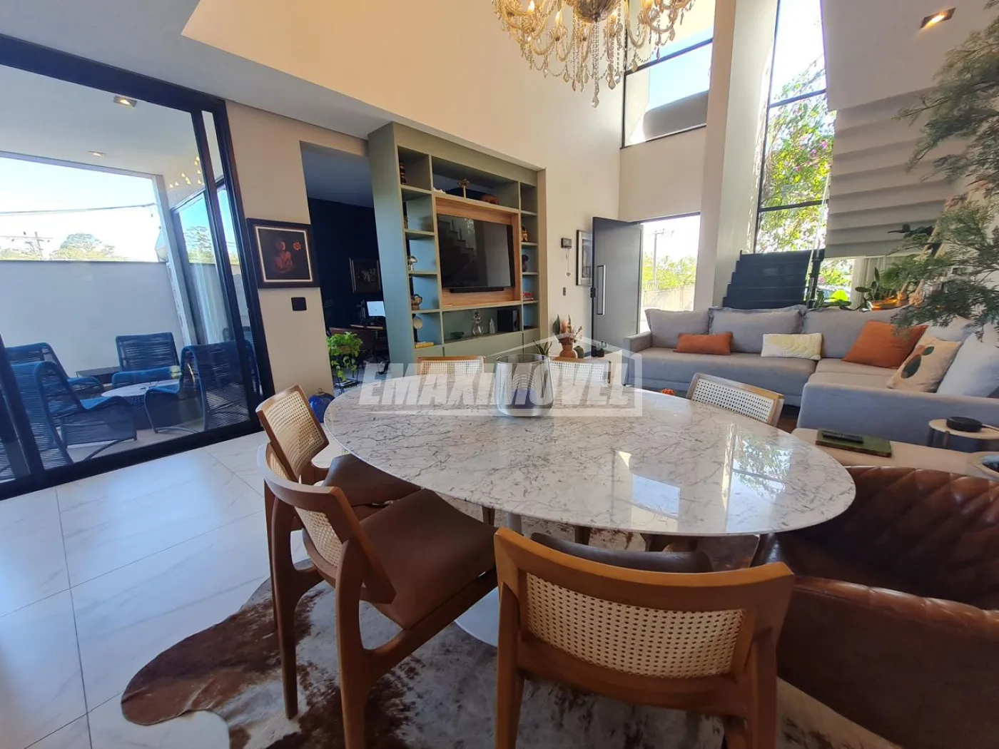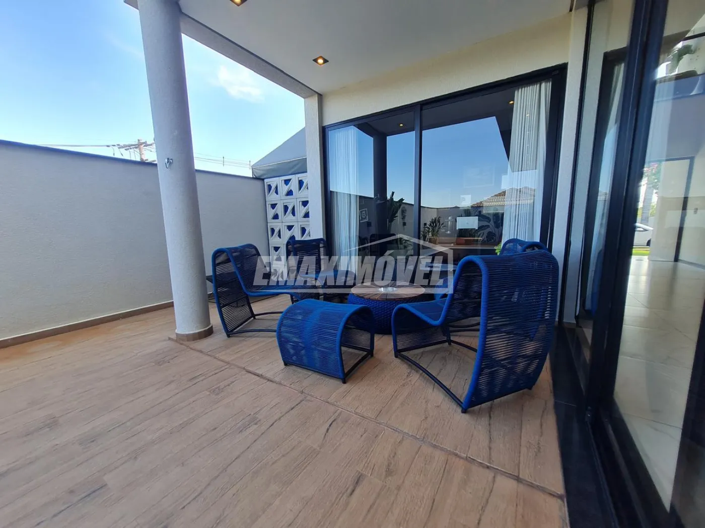 Casa repleta de portas de vidros em toda extensão, trazendo Iluminação natural em toda a casa, com sol da manhã.