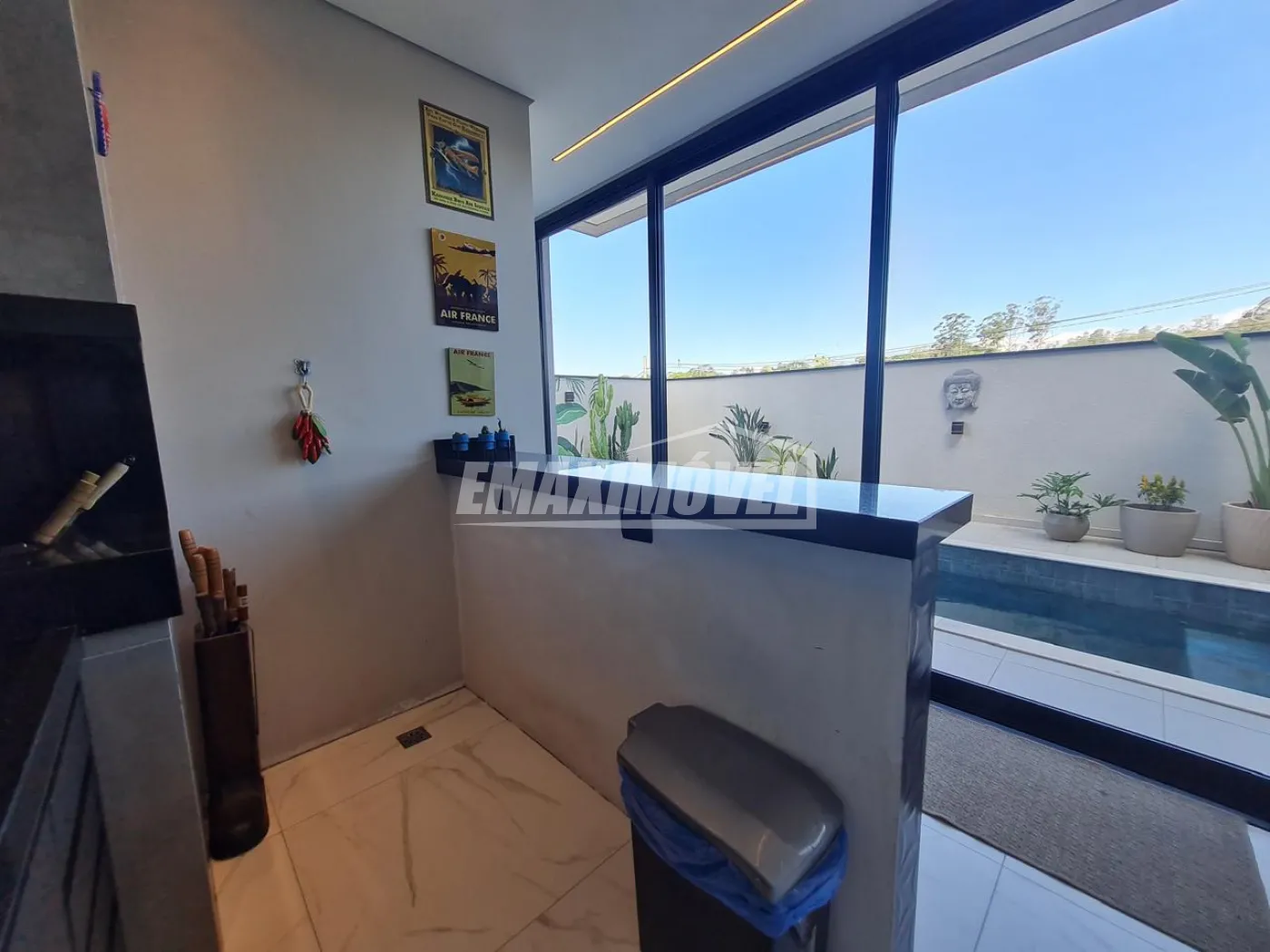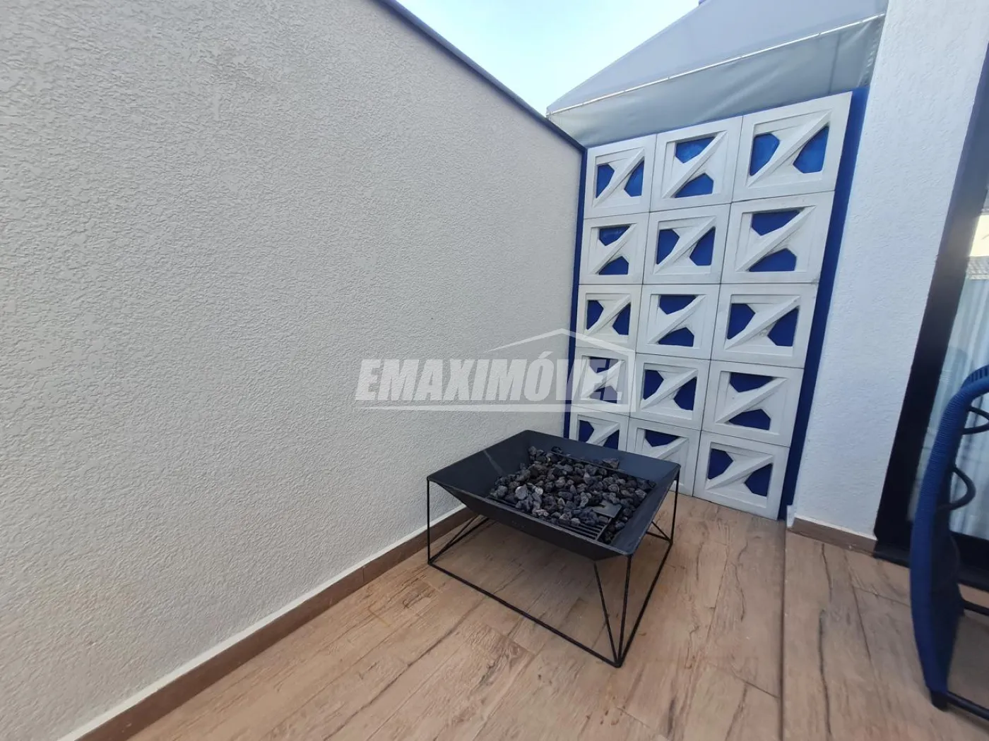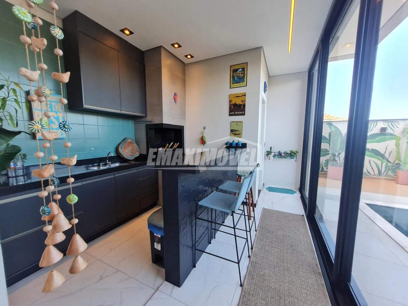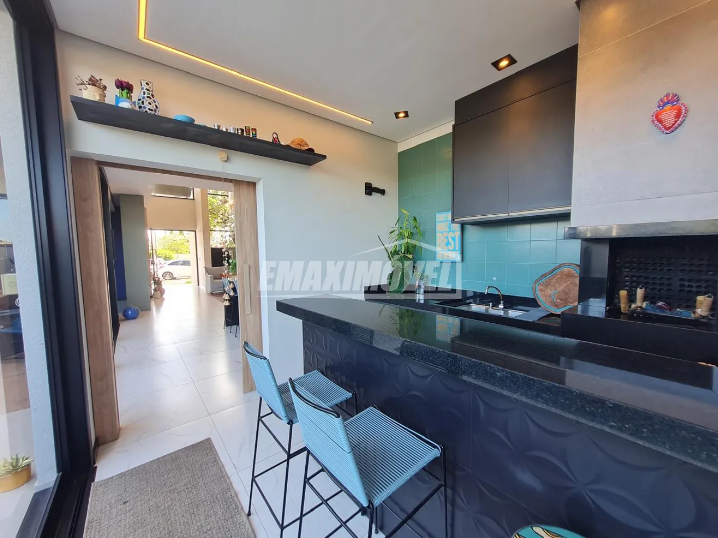Área gourmet com armários e churrasqueira a carvão.