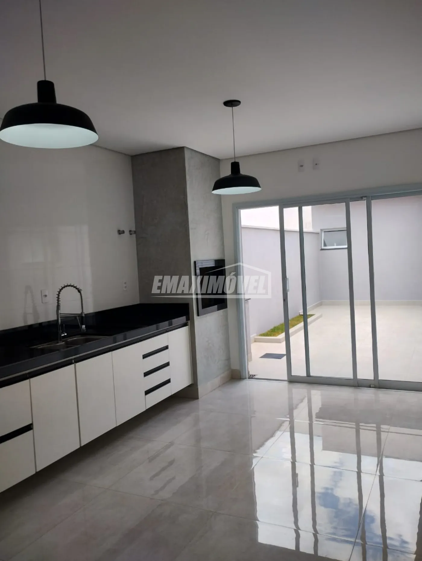 Cozinha integrada à área gourmet com churrasqueira