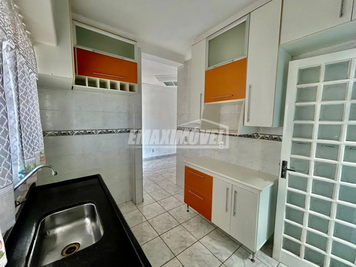 Cozinha com armários e azulejo até o teto