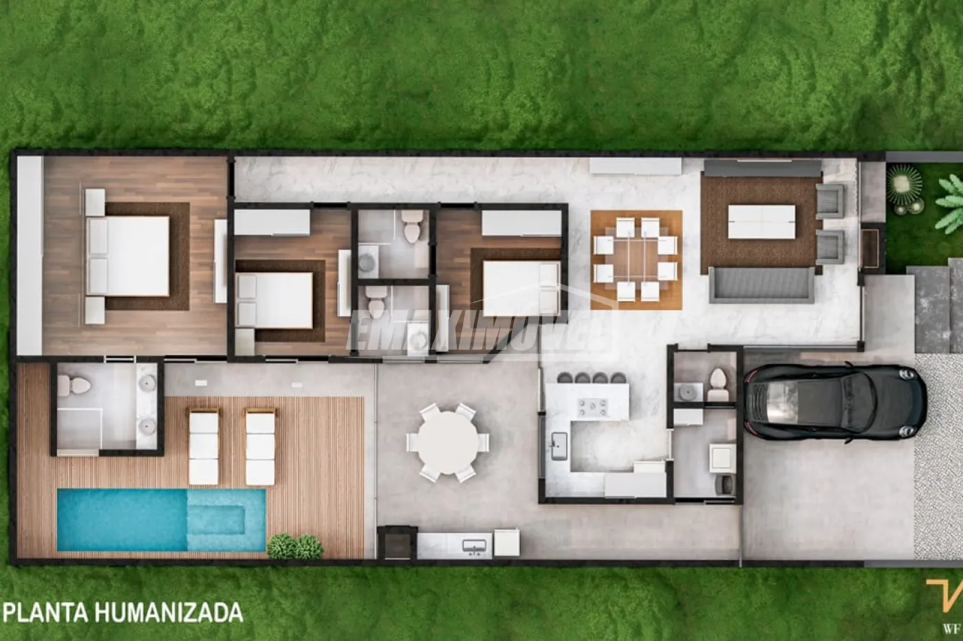 Área de lazer com: salão de festas, piscinas, quadra poliesportiva, campo de futebol, playground e trilhas