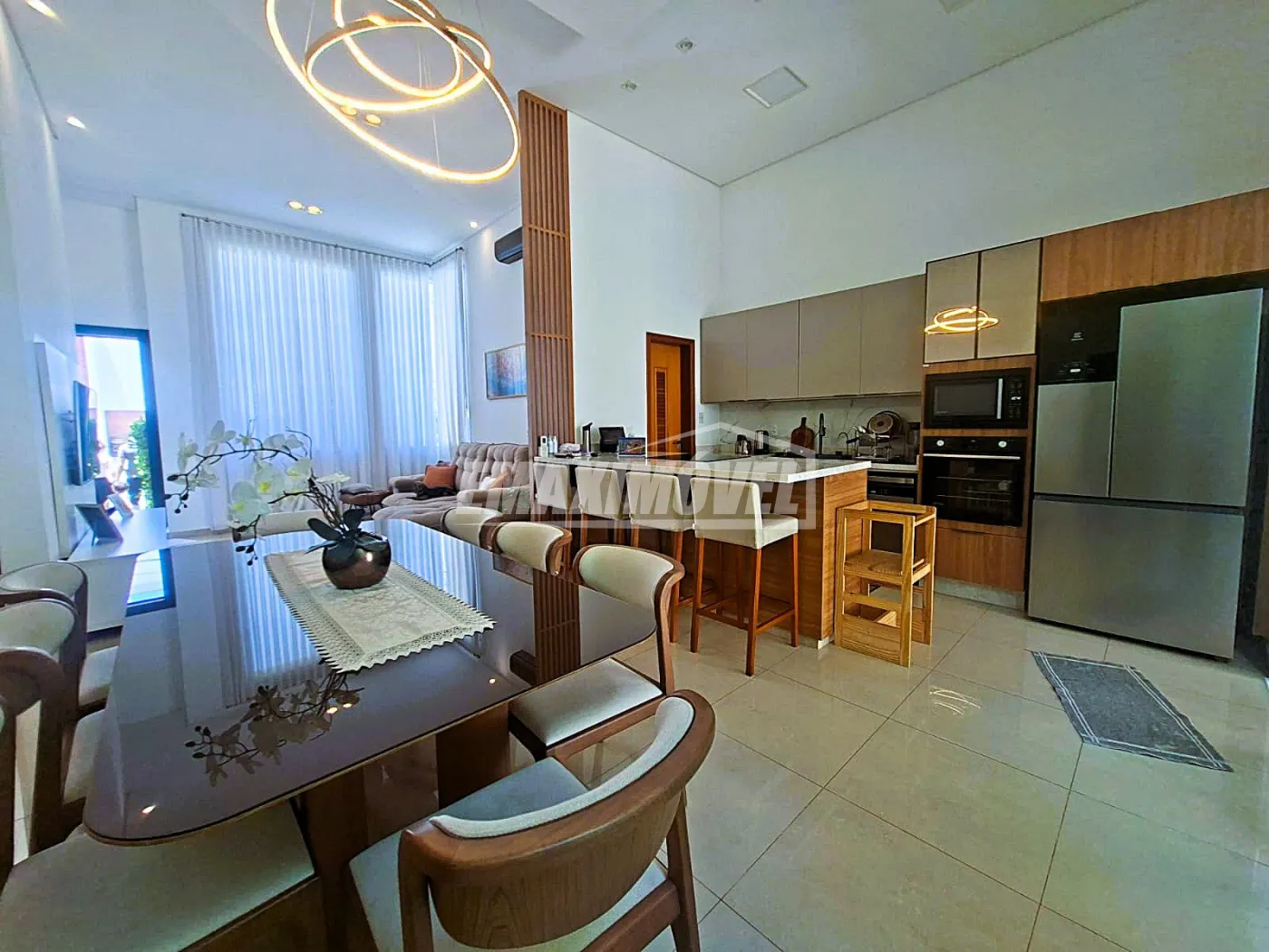 Sala de estar ampla com pé-direito duplo integrada à cozinha