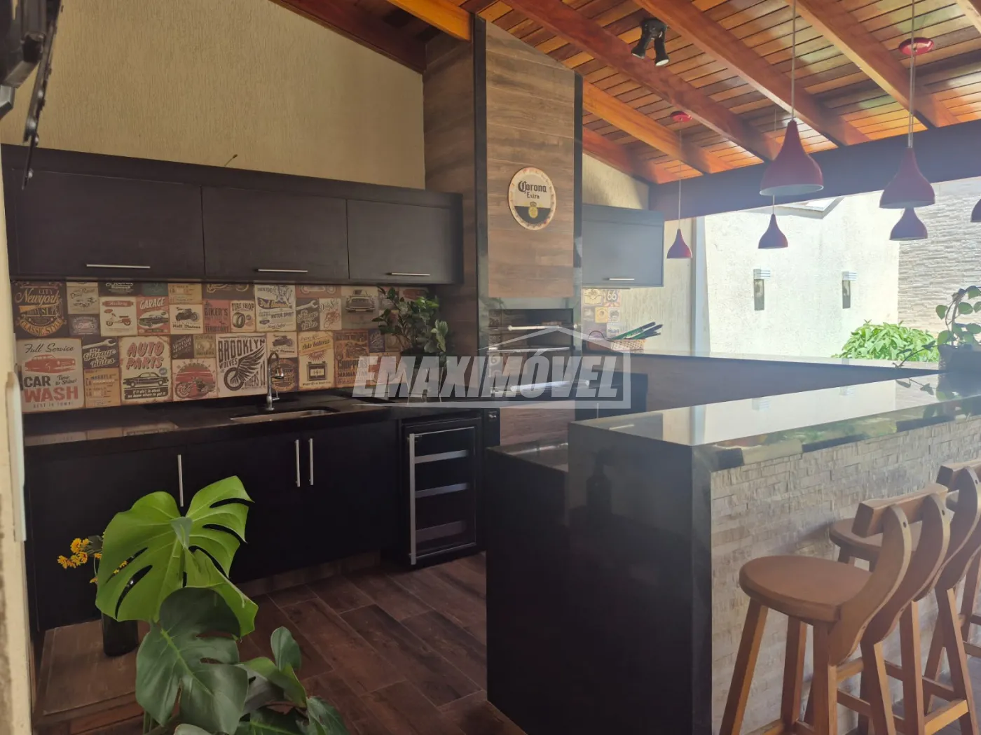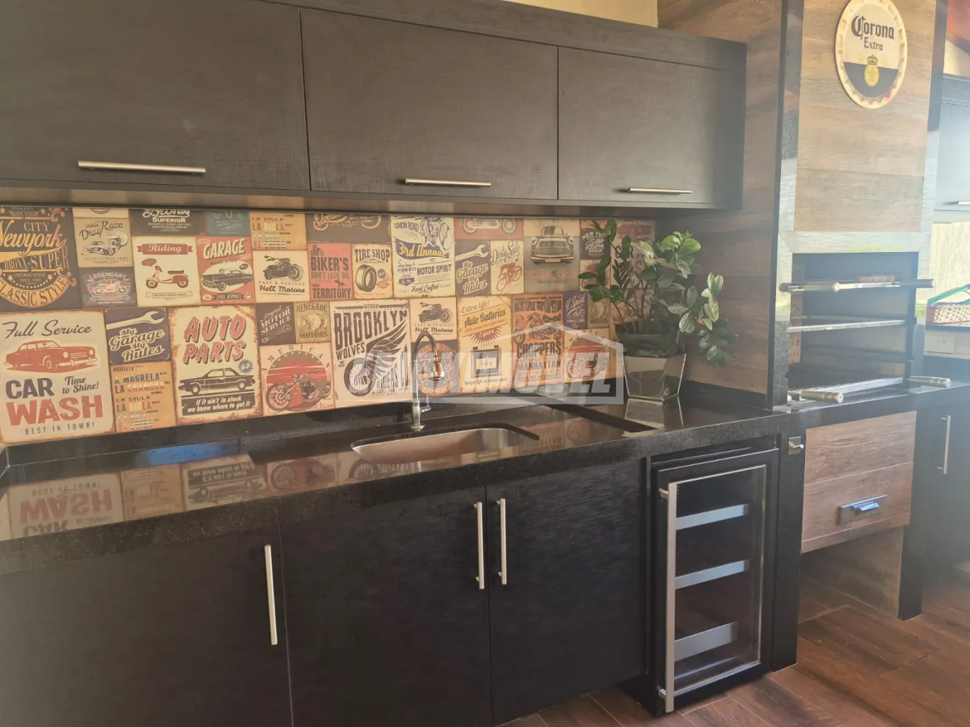 Área gourmet completa com churrasqueira, forno, armários
